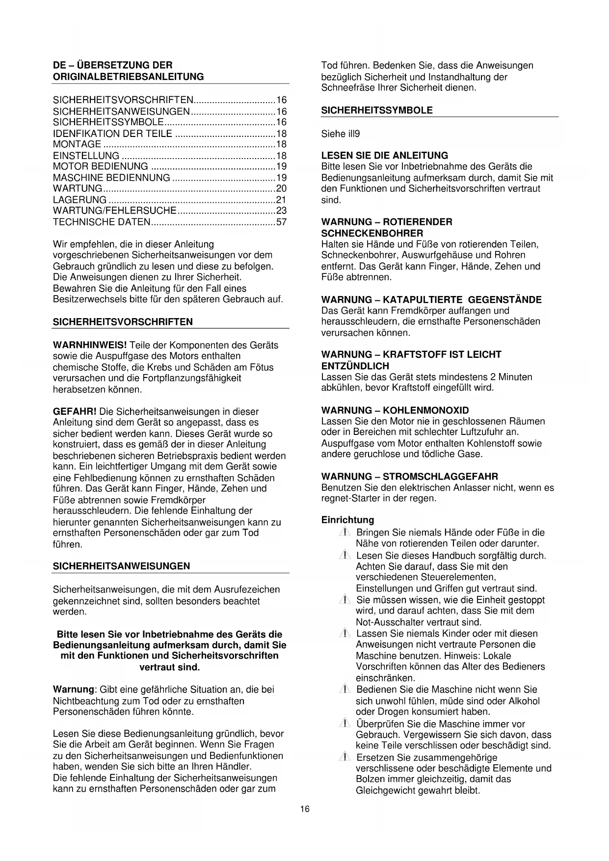 Tod führen. Bedenken Sie, dass die Anweisungen bezüglich Sicherheit und Instandhaltung der Schneefräse Ihrer Sicherheit dienen.