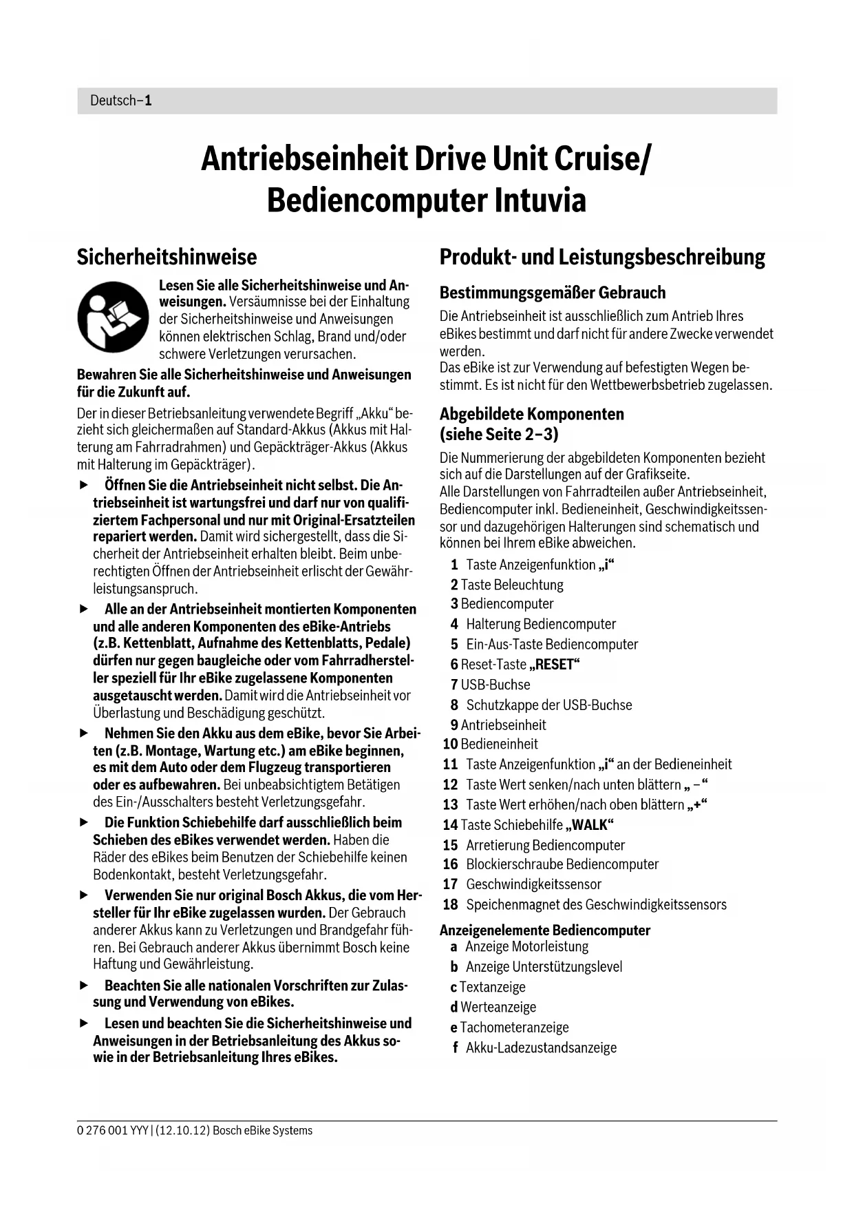 Lesen und beachten Sie die Sicherheitshinweise und Anweisungen in den Betriebsanleitungen von Akku und Antriebseinheit/Bediencomputer sowie in der Betriebsanleitung Ihres eBikes.