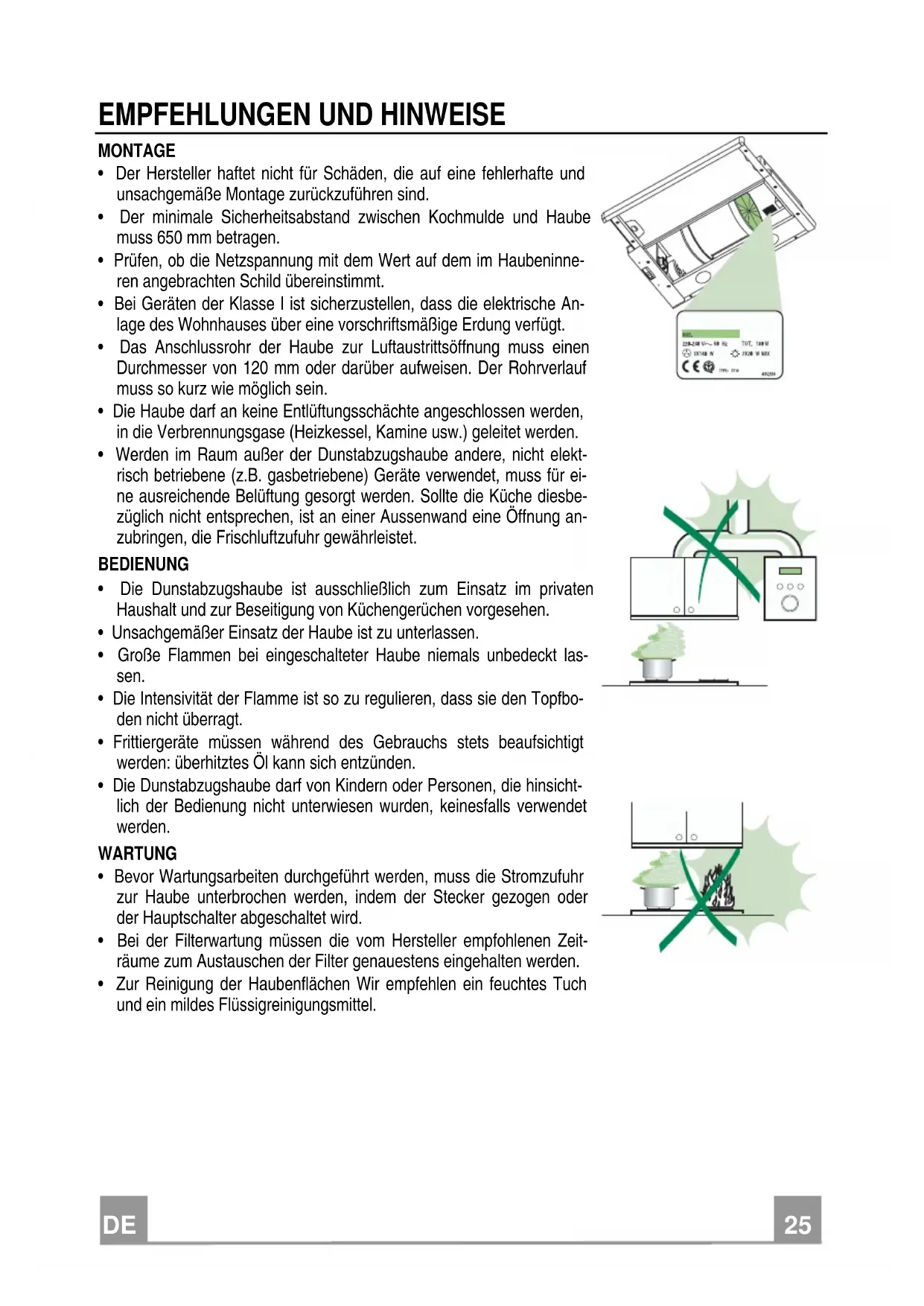 - Die Haube darf an keine Entlüftungsschächte angeschlossen werden, in die Verbrennungsgase (Heizkessel, Kamine usw.) geleitet werden.
