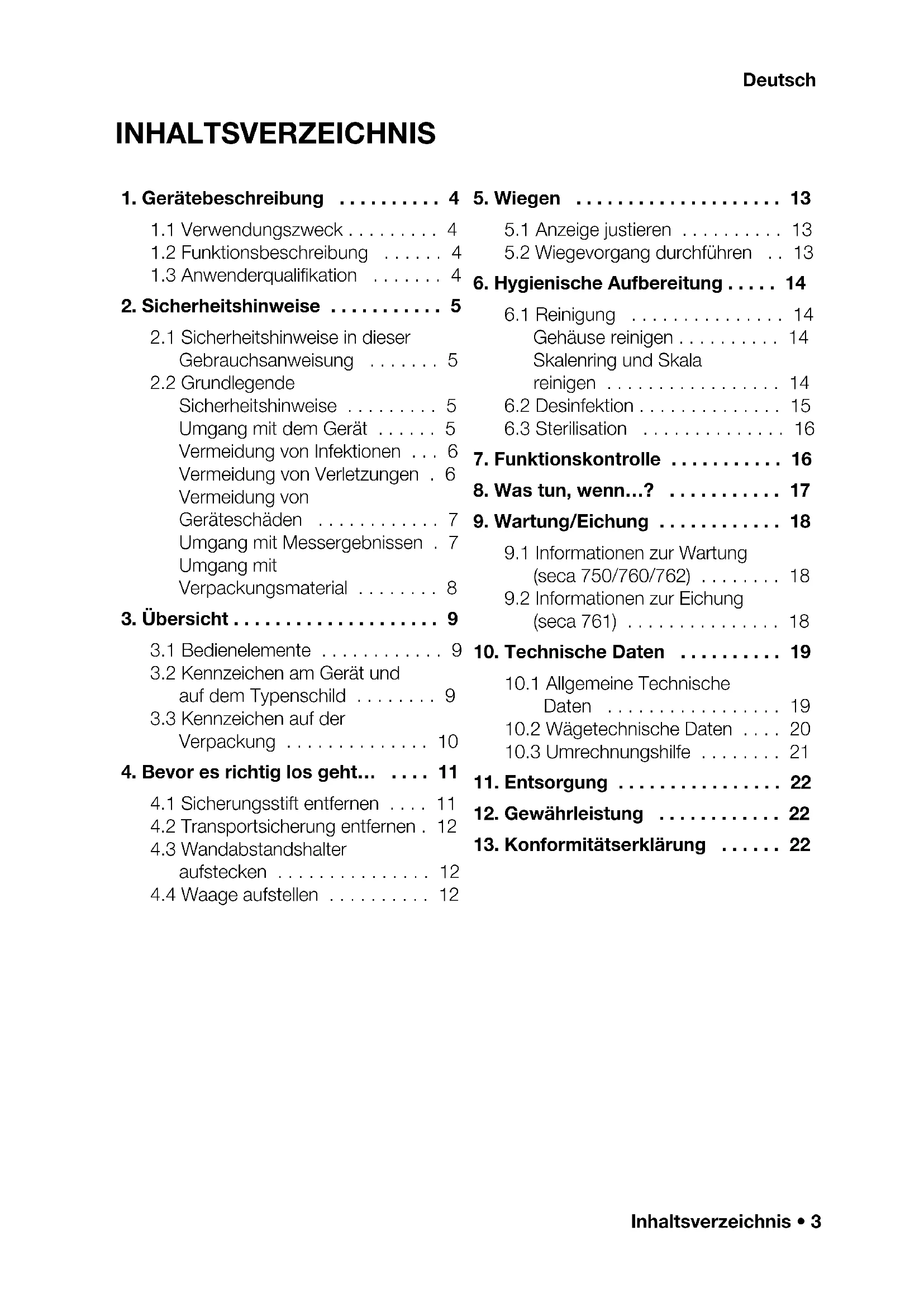 9.1 Informationen zur Wartung (seca 750/760/762) ..... 18
