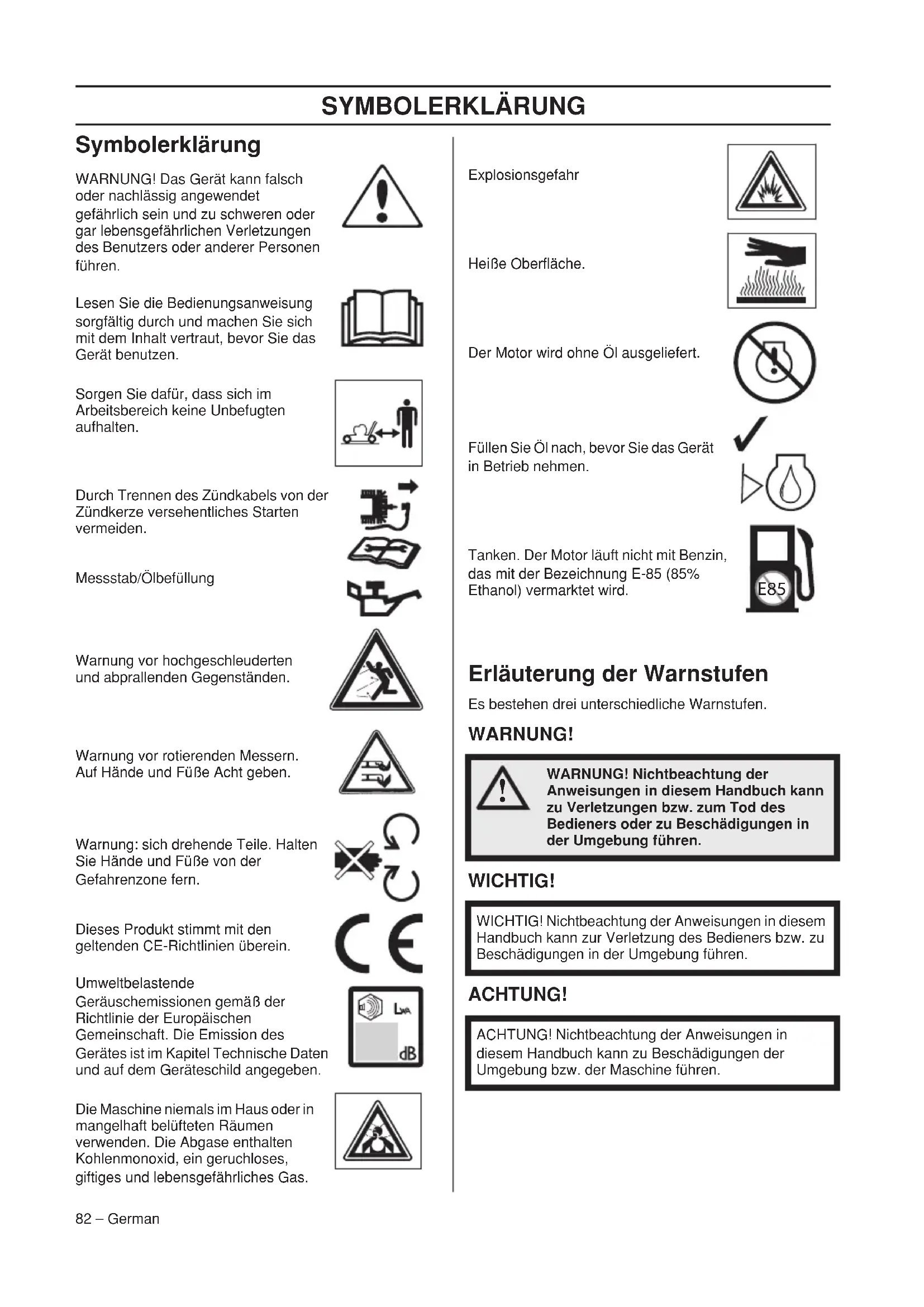 - of May 8, 2000 ”relating to the noise emissions in the environment” 2000/14/EC. For information relating to noise emissions, see the Technical data chapter. The following standards have been applied: ISO 5395, ISO 14982 Notified body: 0404, SMP Svensk Maskinprovning AB, Box 7035, SE-750 07 Uppsala, has issued reports regarding the assessment of conformity according to annex VI of the COUNCIL’S DIRECTIVE of May 8, 2000 ”relating to the noise emissions in the environment” 2000/14/EC. Huskvarna 25 November 2015 Claes Losdal, Development Manager/Garden Products (Authorized representative for Husqvarna AB and responsible for technical documentation.)SYMBOLERKLÄRUNG 82 – German Symbolerklärung WARNUNG! Das Gerät kann falsch oder nachlässig angewendet gefährlich sein und zu schweren oder gar lebensgefährlichen Verletzungen des Benutzers oder anderer Personen führen. Lesen Sie die Bedienungsanweisung sorgfältig durch und machen Sie sich mit dem Inhalt vertraut, bevor Sie das Gerät benutzen. Sorgen Sie dafür, dass sich im Arbeitsbereich keine Unbefugten aufhalten. Durch Trennen des Zündkabels von der Zündkerze versehentliches Starten vermeiden. Messstab/Ölbefüllung