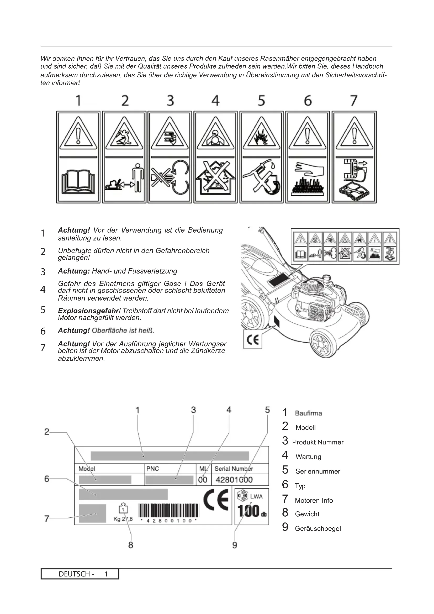 2 Modell 3 Produkt Nummer 4 Wartung 5 Seriennummer 6 Typ 7 Motoren Info 8 Gewicht 9 GeräuschpegelDEUTSCH - SICHERHEITSHINWEISE