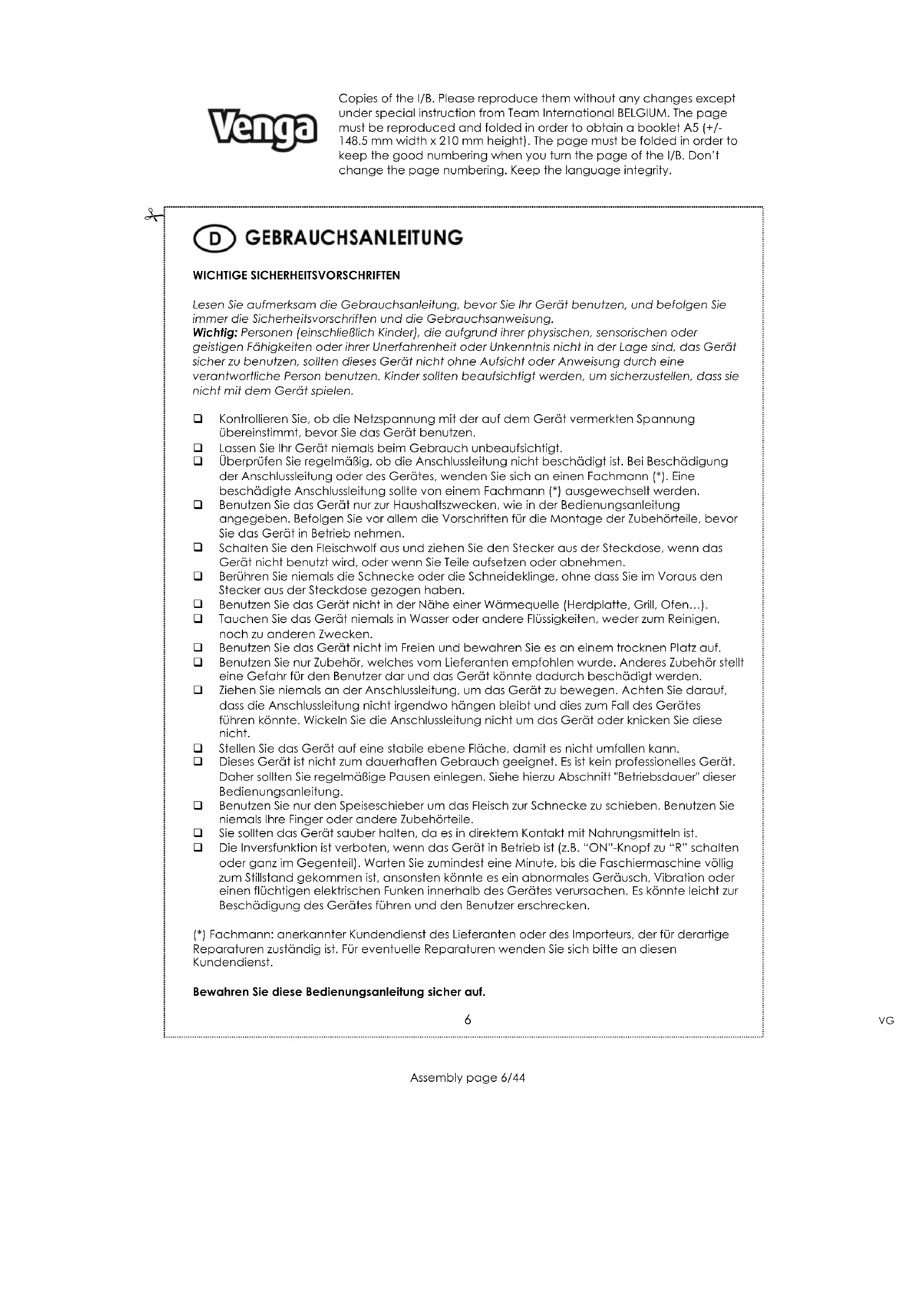 Berühren Sie niemals die Schnecke oder die Schneideklinge, ohne dass Sie im Voraus den Stecker aus der Steckdose gezogen haben. Benutzen Sie das Gerät nicht in der Nähe einer Wärmequelle (Herdplatte, Grill, Ofen…). Tauchen Sie das Gerät niemals in Wasser oder andere Flüssigkeiten, weder zum Reinigen, noch zu anderen Zwecken. Benutzen Sie das Gerät nicht im Freien und bewahren Sie es an einem trocknen Platz auf. Benutzen Sie nur Zubehör, welches vom Lieferanten empfohlen wurde. Anderes Zubehör stellt eine Gefahr für den Benutzer dar und das Gerät könnte dadurch beschädigt werden. Ziehen Sie niemals an der Anschlussleitung, um das Gerät zu bewegen. Achten Sie darauf, dass die Anschlussleitung nicht irgendwo hängen bleibt und dies zum Fall des Gerätes führen könnte. Wickeln Sie die Anschlussleitung nicht um das Gerät oder knicken Sie diese nicht. Stellen Sie das Gerät auf eine stabile ebene Fläche, damit es nicht umfallen kann. Dieses Gerät ist nicht zum dauerhaften Gebrauch geeignet. Es ist kein professionelles Gerät. Daher sollten Sie regelmäßige Pausen einlegen. Siehe hierzu Abschnitt "Betriebsdauer" dieser Bedienungsanleitung. Benutzen Sie nur den Speiseschieber um das Fleisch zur Schnecke zu schieben. Benutzen Sie niemals Ihre Finger oder andere Zubehörteile. Sie sollten das Gerät sauber halten, da es in direktem Kontakt mit Nahrungsmitteln ist. Die Inversfunktion ist verboten, wenn das Gerät in Betrieb ist (z.B. “ON”-Knopf zu “R” schalten oder ganz im Gegenteil). Warten Sie zumindest eine Minute, bis die Faschiermaschine völlig zum Stillstand gekommen ist, ansonsten könnte es ein abnormales Geräusch, Vibration oder einen flüchtigen elektrischen Funken innerhalb des Gerätes verursachen. Es könnte leicht zur Beschädigung des Gerätes führen und den Benutzer erschrecken. (*) Fachmann: anerkannter Kundendienst des Lieferanten oder des Importeurs, der für derartige Reparaturen zuständig ist. Für eventuelle Reparaturen wenden Sie sich bitte an diesen Kundendienst. Bewahren Sie diese Bedienungsanleitung sicher auf. Assembly page 6/44Copies of the I/B. Please reproduce them without any changes except under special instruction from Team International BELGIUM. The page must be reproduced and folded in order to obtain a booklet A5 (+/-