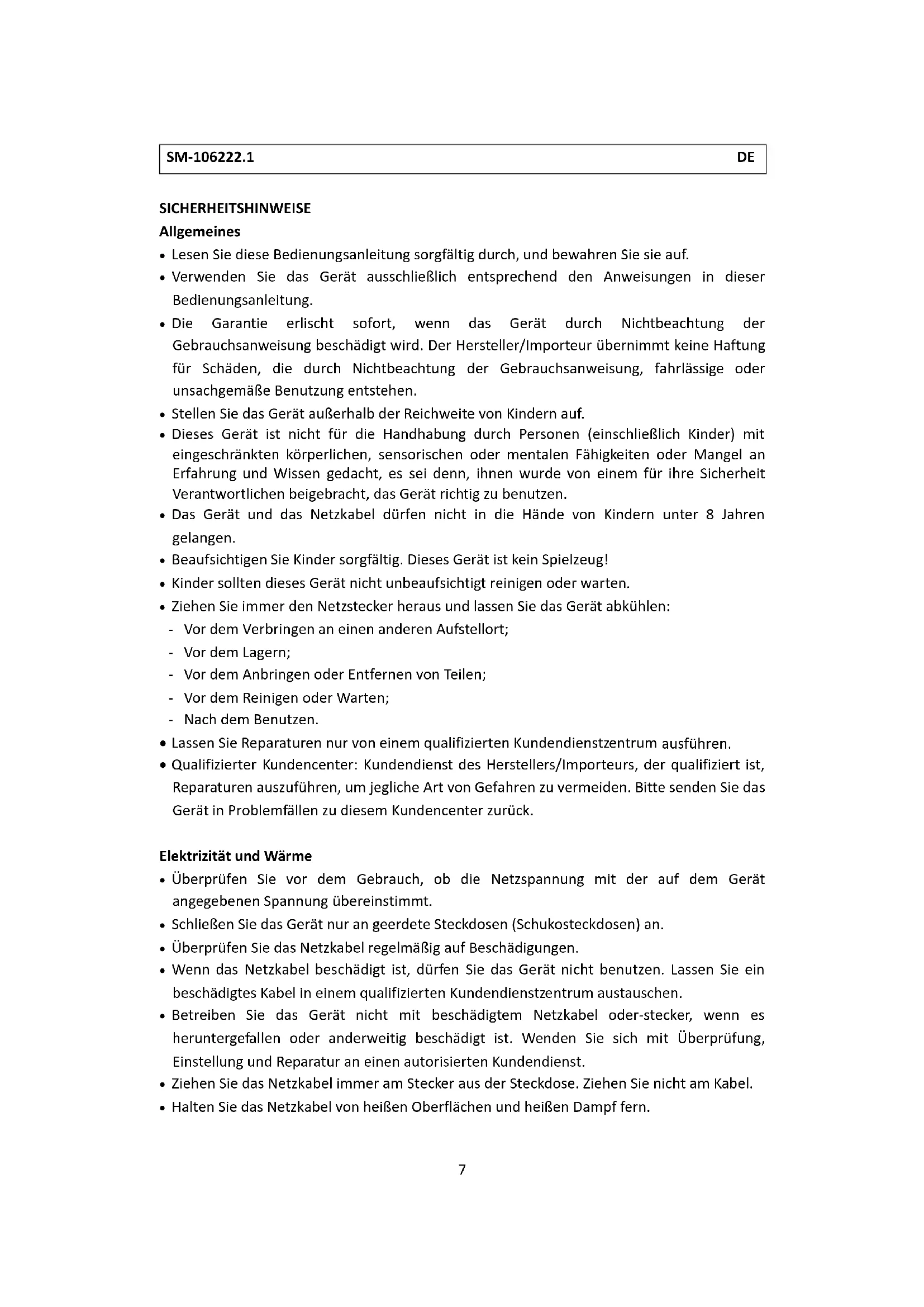 - Qualifizierter Kundencenter: Kundendienst des Herstellers/Importeurs, der qualifiziert ist, Reparaturen auszufahren, um jegliche Art von Gefahren zu vermeiden.itte senden Sie das Gerat in Problemfallen zu dieser Kundencenter zurück.