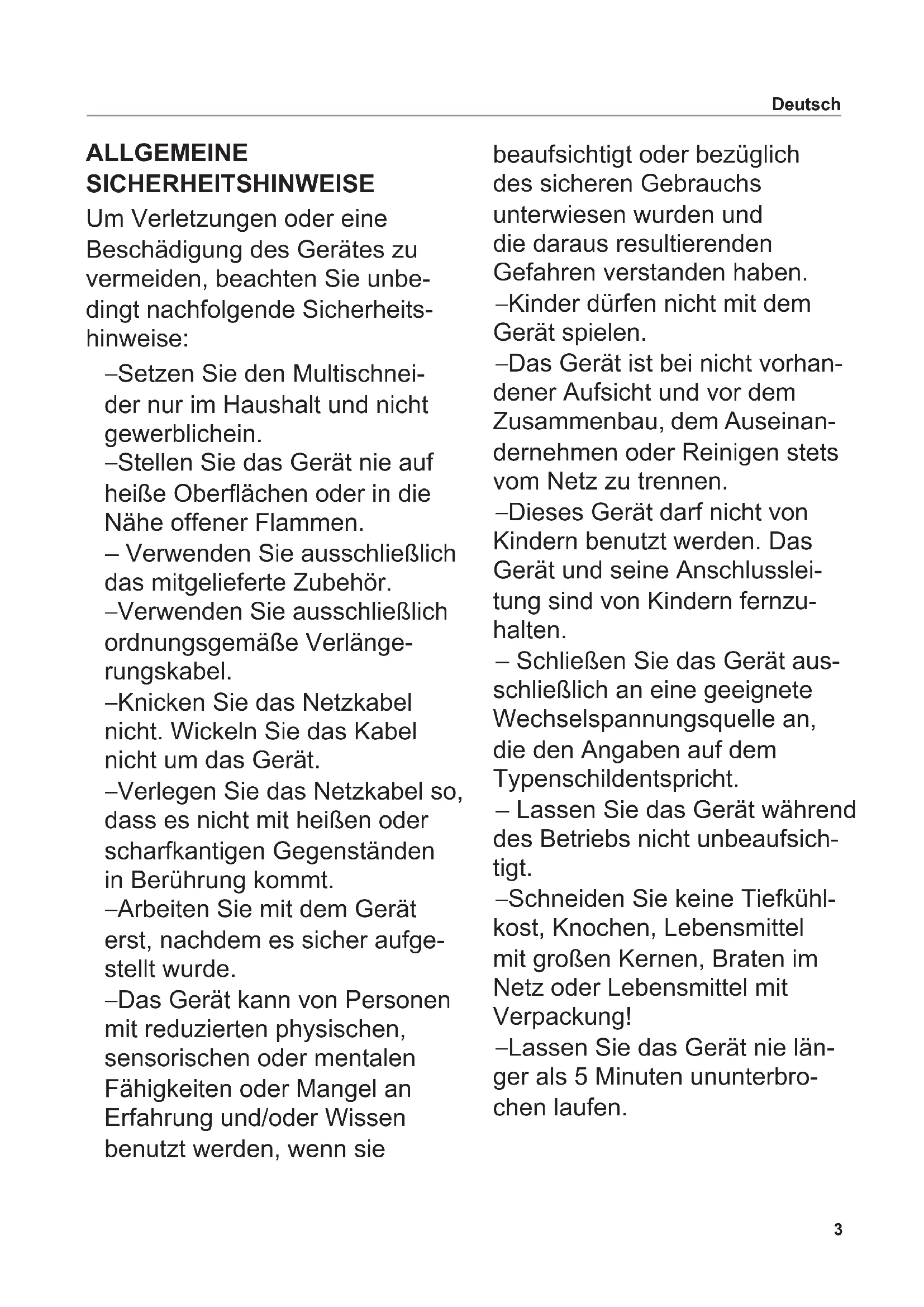 Руководство по использованию ......523 ALLGEMEINE SICHERHEITSHINWEISE Um Verletzungen oder eine Beschädigung des Gerätes zu vermeiden, beachten Sie unbe- dingt nachfolgende Sicherheits- hinweise: – Setzen Sie den Multischnei- der nur im Haushalt und nicht gewerblich ein. – Stellen Sie das Gerät nie auf heiße Oberächen oder in die Nähe offener Flammen. – Verwenden Sie ausschließlich das mitgelieferte Zubehör. – Verwenden Sie ausschließlich ordnungsgemäße Verlänge- rungskabel. – Knicken Sie das Netzkabel nicht. Wickeln Sie das Kabel nicht um das Gerät. – Verlegen Sie das Netzkabel so, dass es nicht mit heißen oder scharfkantigen Gegenständen in Berührung kommt. – Arbeiten Sie mit dem Gerät erst, nachdem es sicher aufge- stellt wurde. – Das Gerät kann von Personen mit reduzierten physischen, sensorischen oder mentalen Fähigkeiten oder Mangel an Erfahrung und/oder Wissen benutzt werden, wenn sie beaufsichtigt oder bezüglich des sicheren Gebrauchs unterwiesen wurden und die daraus resultierenden Gefahren verstanden haben. – Kinder dürfen nicht mit dem Gerät spielen. – Das Gerät ist bei nicht vorhan- dener Aufsicht und vor dem Zusammenbau, dem Auseinan- dernehmen oder Reinigen stets vom Netz zu trennen. – Dieses Gerät darf nicht von Kindern benutzt werden. Das Gerät und seine Anschlusslei- tung sind von Kindern fernzu- halten. – Schließen Sie das Gerät aus- schließlich an eine geeignete Wechselspannungsquelle an, die den Angaben auf dem Typenschild entspricht. – Lassen Sie das Gerät während des Betriebs nicht unbeaufsich- tigt. – Schneiden Sie keine Tiefkühl- kost, Knochen, Lebensmittel mit großen Kernen, Braten im Netz oder Lebensmittel mit Verpackung! – Lassen Sie das Gerät nie län- ger als 5 Minuten ununterbro- chen laufen. Deutsch4 Stromschlaggefahr – Ziehen Sie bei Betriebsstö- rungen, vor jeder Reinigung und wenn das Gerät nicht in Gebrauch ist, immer den Netz- stecker aus der Steckdose. Ziehen Sie dabei am Stecker und nicht am Kabel. – Tauchen Sie das Gerät nie ins Wasser. Setzen Sie das Gerät niemals Regen oder anderer Feuchtigkeit aus. Sollte das Gerät doch ein- mal ins Wasser gefallen sein, ziehen Sie erst den Netzste- cker aus der Steckdose und nehmen Sie dann das Gerät aus dem Wasser. Lassen Sie danach das Gerät von einer zugelassenen Servicestelle überprüfen, bevor Sie es wie- der in Betrieb nehmen. – Benutzen Sie das Gerät nicht mit feuchten Händen. Benutzen Sie es nicht, wenn es feucht oder nass ist oder wenn Sie auf feuchtem Boden stehen. Betreiben Sie das Gerät nicht im Freien. – Stellen Sie bei Beschädigun- gen von Geräteteilen den Betrieb sofort ein. Schicken Sie das komplette Gerät dem ritter-Kundendienst zu. – Wenn das Netzkabel beschä- digt wird, muss dieses durch den Hersteller, seinen Kunden- dienst oder ähnlich qualizierte Personen ersetzt werden, um Gefährdungen zu vermeiden. Verletzungsgefahr – Dieses Gerät darf nicht ohne Schneidgutschlitten oder Reste halter benutzt werden, es sei denn die Größe und Form des Schneidguts lässt deren Gebrauch nicht zu. – Vor dem Auswechseln von Zubehör oder Zusatzteilen, die im Betrieb bewegt werden, muss das Gerät ausgeschaltet und vom Netz getrennt werden. – Das Rundmesser ist sehr scharf. – Berühren Sie bei Betrieb des Geräts keinesfalls das Rund- messer! – Schalten Sie vor dem Reini- gen das Gerät aus, ziehen Sie den Netzstecker aus der Steckdose und drehen Sie den Schnittstärke- Verstellknopf in die „0“-Position. – Das Rundmesser läuft nach dem Ausschalten etwas nach. Deutsch5 Klappen Sie die Graken im vorderen und hinteren Buchrü- cken aus. Bitte lesen Sie die Anleitung vor Inbetriebnahme des Gerätes sorgfältig durch. Bewahren Sie die Gebrauchsanleitung auf und geben Sie diese bei Weitergabe des Gerätes mit. Alternativ steht diese Gebrauchs- anleitung unter www.ritterwerk.de zur Verfügung. ZWECKBESTIMMUNG Der MultiSchneider dient zum Schneiden von haushaltsüblichen Lebensmitteln. Nicht bestimmungsgemä- ßer Gebrauch oder falsche Bedienung kann zu schweren Verletzungen oder zur Beschä- digung des Gerätes führen. Es entfallen sämtliche Garantie- und Haftungsansprüche. INBETRIEBNAHME Vorbereitung Nehmen Sie das Gerät vorsichtig aus der Verpackung. Entfernen Sie alle Verpackungsteile und bewahren Sie diese gemeinsam mit der Verpackung auf. Reinigen Sie das Gerät, bevor es mit Lebensmitteln in Verbindung kommt (siehe REINIGEN). Gerät aufstellen