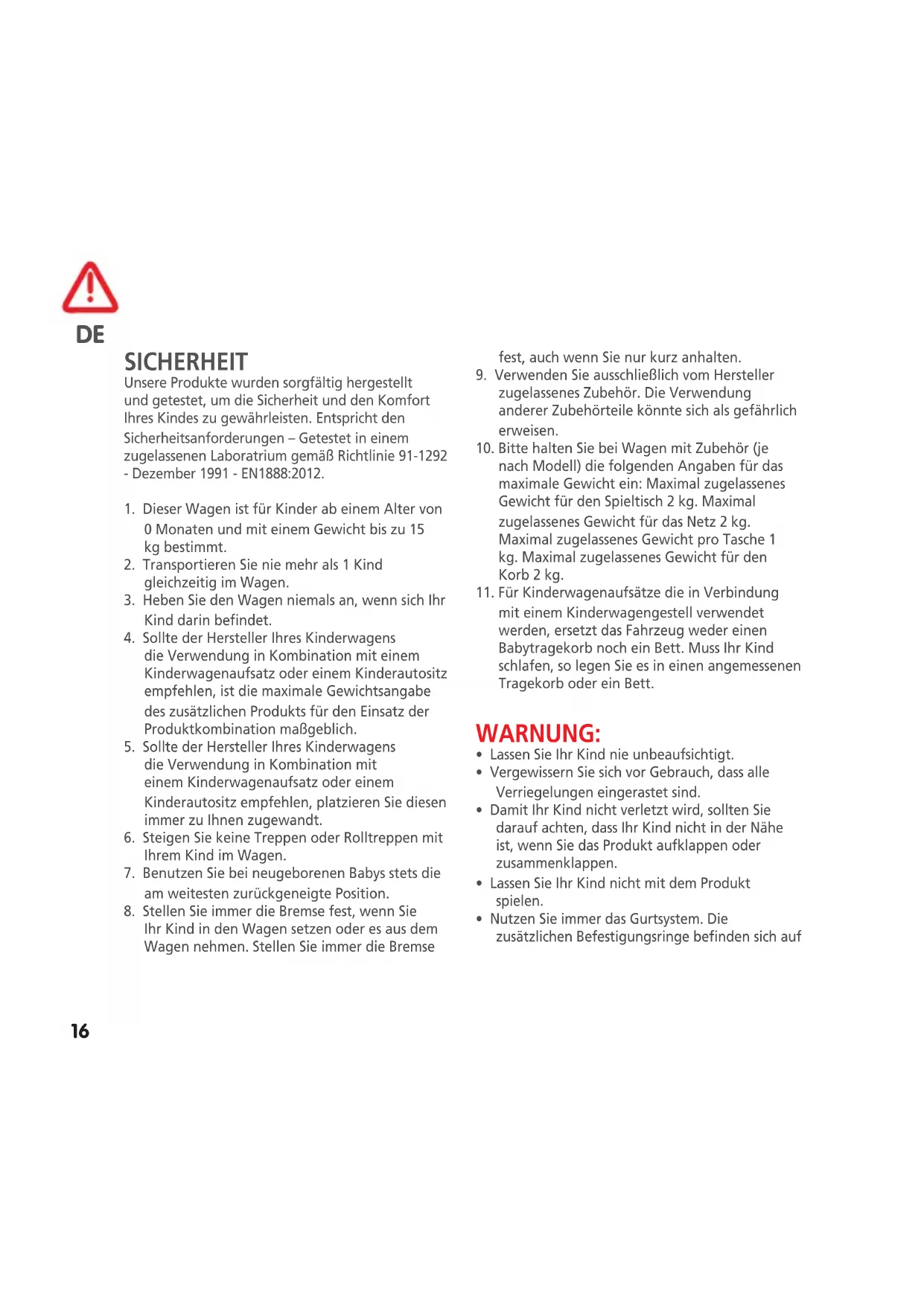 SICHERHEIT Unsere Produkte wurden sorgfältig hergestellt und getestet, um die Sicherheit und den Komfort Ihres Kindes zu gewährleisten. Entspricht den Sicherheitsanforderungen – Getestet in einem zugelassenen Laboratrium gemäß Richtlinie 91-1292 - Dezember 1991 - EN1888:2012.