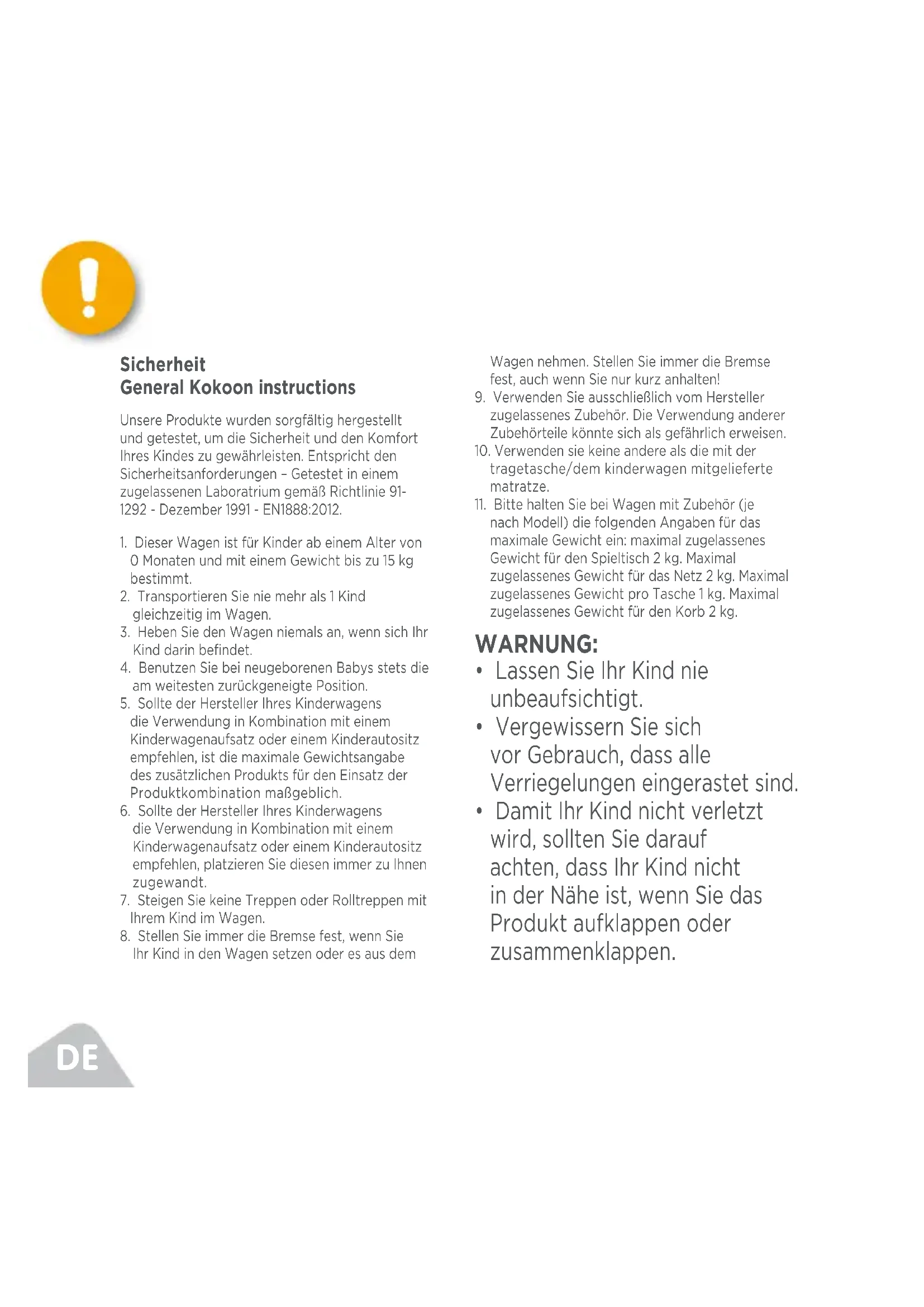 Sicherheit General Kokoon instructions Unsere Produkte wurden sorgfältig hergestellt und getestet, um die Sicherheit und den Komfort Ihres Kindes zu gewährleisten. Entspricht den Sicherheitsanforderungen – Getestet in einem zugelassenen Laboratrium gemäß Richtlinie 91- 1292 - Dezember 1991 - EN1888:2012.