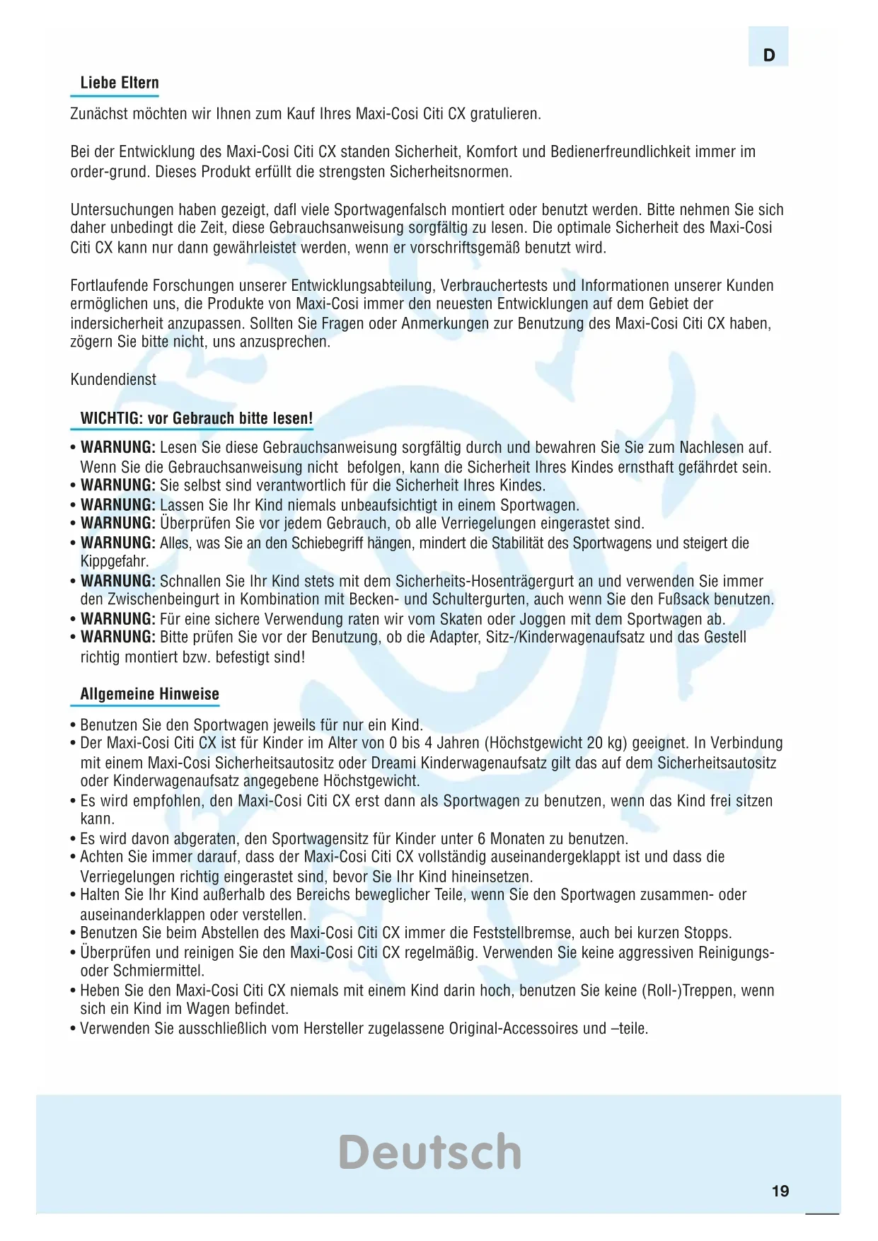 GarantieLiebe Eltern Zunächst möchten wir Ihnen zum Kauf Ihres Maxi-Cosi Citi CX gratulieren. Bei der Entwicklung des Maxi-Cosi Citi CX standen Sicherheit, Komfort und Bedienerfreundlichkeit immer im order-grund. Dieses Produkt erfüllt die strengsten Sicherheitsnormen. Untersuchungen haben gezeigt, dafl viele Sportwagenfalsch montiert oder benutzt werden. Bitte nehmen Sie sich daher unbedingt die Zeit, diese Gebrauchsanweisung sorgfältig zu lesen. Die optimale Sicherheit des Maxi-Cosi Citi CX kann nur dann gewährleistet werden, wenn er vorschriftsgemäß benutzt wird. Fortlaufende Forschungen unserer Entwicklungsabteilung, Verbrauchertests und Informationen unserer Kunden ermöglichen uns, die Produkte von Maxi-Cosi immer den neuesten Entwicklungen auf dem Gebiet der indersicherheit anzupassen. Sollten Sie Fragen oder Anmerkungen zur Benutzung des Maxi-Cosi Citi CX haben, zögern Sie bitte nicht, uns anzusprechen. Kundendienst WICHTIG: vor Gebrauch bitte lesen!