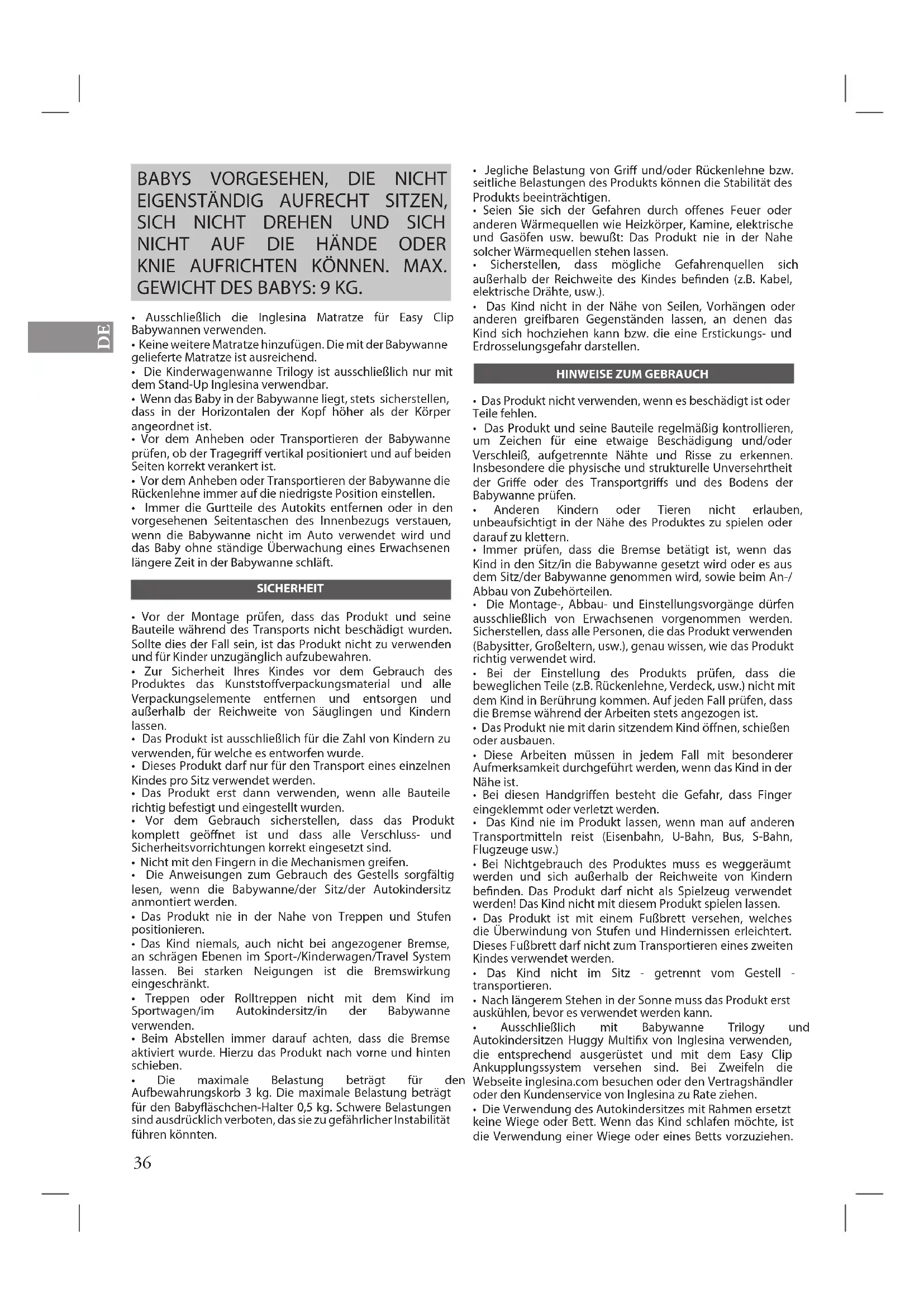 - Ausschließlich mit Babywanne Trilogy und Autokindersitzen Huggy Multix von Inglesina verwenden, die entsprechend ausgerüstet und mit dem Easy Clip Ankupplungssystem versehen sind. Bei Zweifeln die Webseite inglesina.com besuchen oder den Vertragshändler oder den Kundenservice von Inglesina zu Rate ziehen.