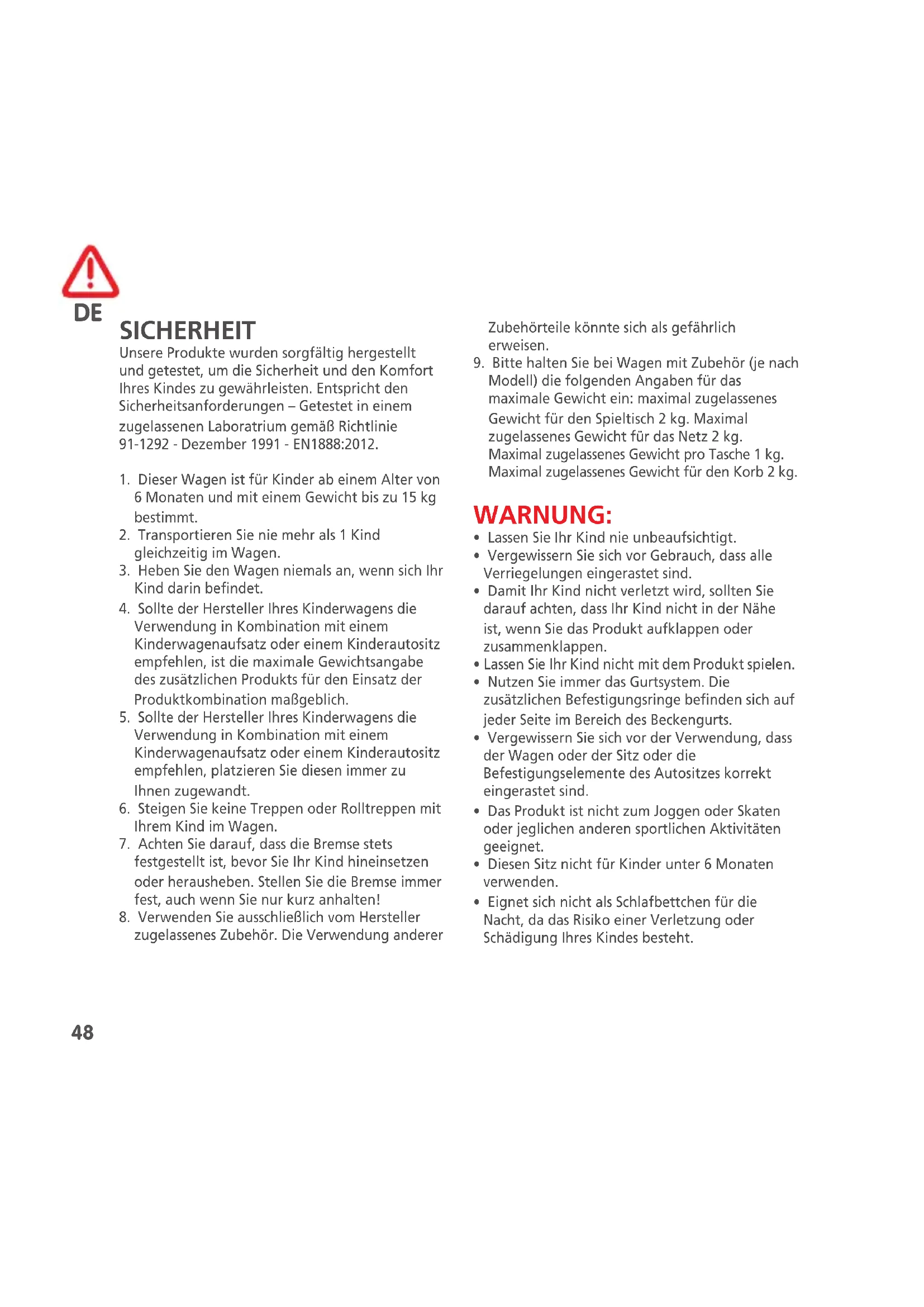 SICHERHEIT Unsere Produkte wurden sorgfältig hergestellt und getestet, um die Sicherheit und den Komfort Ihres Kindes zu gewährleisten. Entspricht den Sicherheitsanforderungen – Getestet in einem zugelassenen Laboratrium gemäß Richtlinie 91-1292 - Dezember 1991 - EN1888:2012.