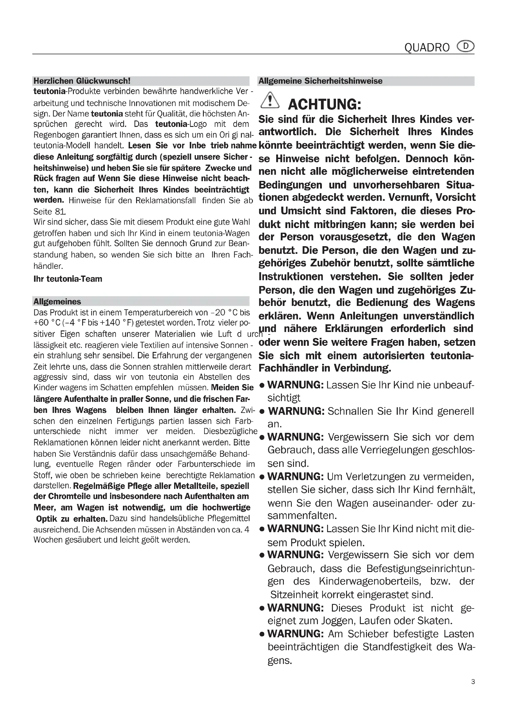 Wir sind sicher, dass Sie mit diesem Produkt eine gute Wahl getroffen haben und sich Ihr Kind in einem teutonia-Wagen gut aufgehoben fühlt. Sollten Sie dennoch Grund zur Bean- standung haben, so wenden Sie sich bitte an Ihren Fach- händler. Ihr teutonia-Team Allgemeines Das Produkt ist in einem Temperaturbereich von –20 °C bis +60 °C (–4 °F bis +140 °F) getestet worden. Trotz vieler po- sitiver Eigen schaften unserer Materialien wie Luft d urch - lässigkeit etc. reagieren viele Textilien auf intensive Sonnen - ein strahlung sehr sensibel. Die Erfahrung der vergangenen Zeit lehrte uns, dass die Sonnen strahlen mittlerweile derart aggressiv sind, dass wir von teutonia ein Abstellen des Kinder wagens im Schatten empfehlen müssen. Meiden Sie längere Aufenthalte in praller Sonne, und die frischen Far- ben Ihres Wagens bleiben Ihnen länger erhalten. Zwi- schen den einzelnen Fertigungs partien lassen sich Farb- unterschiede nicht immer ver meiden. Diesbezügliche Reklamationen können leider nicht anerkannt werden. Bitte haben Sie Verständnis dafür dass unsachgemäße Behand- lung, eventuelle Regen ränder oder Farbunterschiede im Stoff, wie oben be schrieben keine berechtigte Reklamation darstellen. Regelmäßige Pflege aller Metallteile, speziell der Chromteile und insbesondere nach Aufenthalten am Meer, am Wagen ist notwendig, um die hochwertige Optik zu erhalten. Dazu sind handelsübliche Pflegemittel ausreichend. Die Achsenden müssen in Abständen von ca. 4 Wochen gesäubert und leicht geölt werden. Allgemeine Sicherheitshinweise ACHTUNG: Sie sind für die Sicherheit Ihres Kindes ver- antwortlich. Die Sicherheit Ihres Kindes könnte beeinträchtigt werden, wenn Sie die- se Hinweise nicht befolgen. Dennoch kön- nen nicht alle möglicherweise eintretenden Bedingungen und unvorhersehbaren Situa- tionen abgedeckt werden. Vernunft, Vorsicht und Umsicht sind Faktoren, die dieses Pro- dukt nicht mitbringen kann; sie werden bei der Person vorausgesetzt, die den Wagen benutzt. Die Person, die den Wagen und zu- gehöriges Zubehör benutzt, sollte sämtliche Instruktionen verstehen. Sie sollten jeder Person, die den Wagen und zugehöriges Zu- behör benutzt, die Bedienung des Wagens erklären. Wenn Anleitungen unverständlich und nähere Erklärungen erforderlich sind oder wenn Sie weitere Fragen haben, setzen Sie sich mit einem autorisierten teutonia- Fachhändler in Verbindung. ● WARNUNG: Lassen Sie Ihr Kind nie unbeauf- sichtigt ● WARNUNG: Schnallen Sie Ihr Kind generell an. ● WARNUNG: Vergewissern Sie sich vor dem Gebrauch, dass alle Verriegelungen geschlos- sen sind. ● WARNUNG: Um Verletzungen zu vermeiden, stellen Sie sicher, dass sich Ihr Kind fernhält, wenn Sie den Wagen auseinander- oder zu- sammenfalten. ● WARNUNG: Lassen Sie Ihr Kind nicht mit die- sem Produkt spielen. ● WARNUNG: Vergewissern Sie sich vor dem Gebrauch, dass die Befestigungseinrichtun- gen des Kinderwagenoberteils, bzw. der Sitzeinheit korrekt eingerastet sind. ● WARNUNG: Dieses Produkt ist nicht ge - eignet zum Joggen, Laufen oder Skaten. ● WARNUNG: Am Schieber befestigte Lasten beeinträchtigen die Standfestigkeit des Wa- gens.