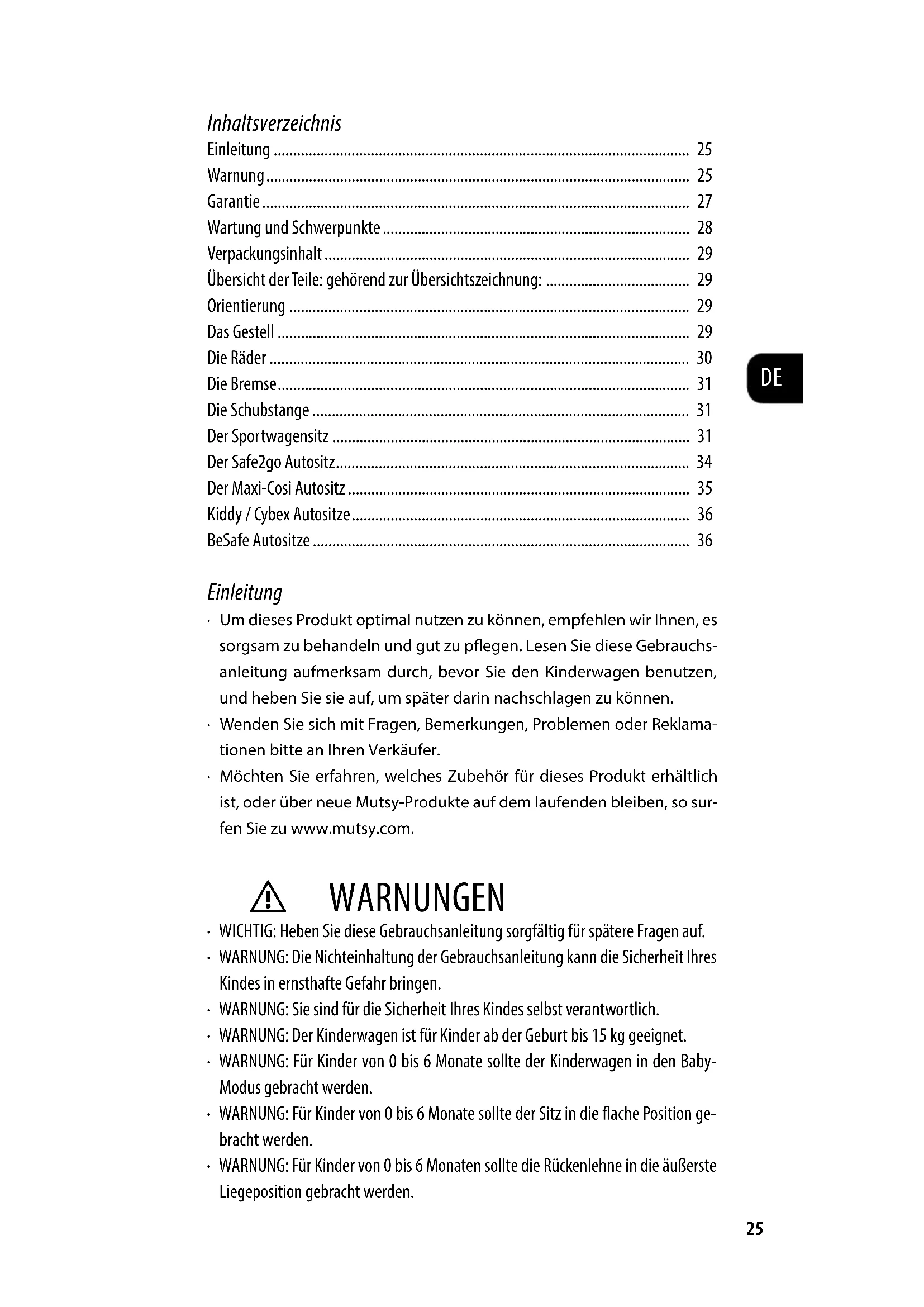 - WARNUNG: Werden mehr Taschen und/oder Zubehör auf das Produkt gelegt, als vom Hersteller empfohlen, dann kann dies zu einem unstabilen Kinderwagen führen. Verwenden Sie ausschließlich Originalzubehör von Mutsy.