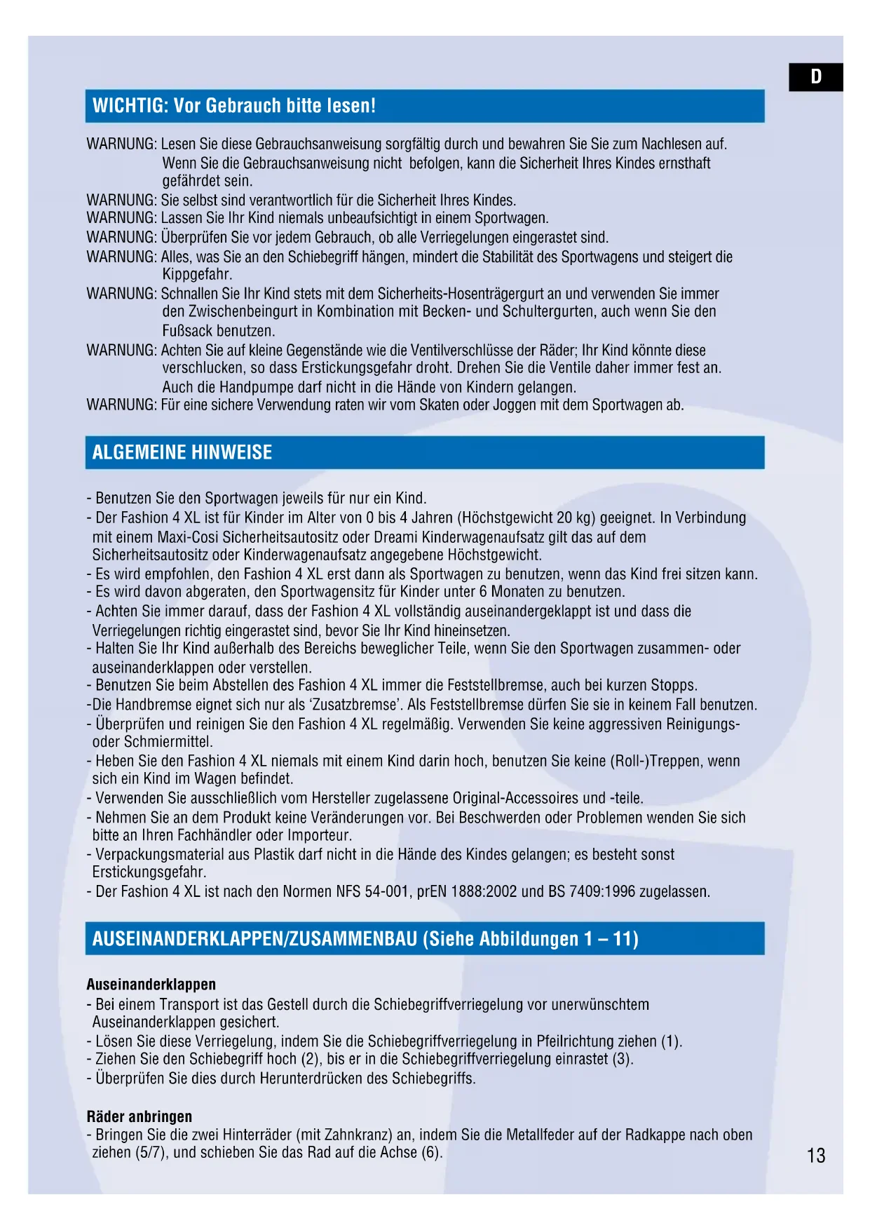 WICHTIG: Vor Gebrauch bitte lesen! WARNUNG: Lesen Sie diese Gebrauchsanweisung sorgfältig durch und bewahren Sie Sie zum Nachlesen auf. Wenn Sie die Gebrauchsanweisung nicht befolgen, kann die Sicherheit Ihres Kindes ernsthaft gefährdet sein. WARNUNG: Sie selbst sind verantwortlich für die Sicherheit Ihres Kindes. WARNUNG: Lassen Sie Ihr Kind niemals unbeaufsichtigt in einem Sportwagen. WARNUNG: Überprüfen Sie vor jedem Gebrauch, ob alle Verriegelungen eingerastet sind. WARNUNG: Alles, was Sie an den Schiebegriff hängen, mindert die Stabilität des Sportwagens und steigert die Kippgefahr. WARNUNG: Schnallen Sie Ihr Kind stets mit dem Sicherheits-Hosenträgergurt an und verwenden Sie immer den Zwischenbeingurt in Kombination mit Becken- und Schultergurten, auch wenn Sie den Fußsack benutzen. WARNUNG: Achten Sie auf kleine Gegenstände wie die Ventilverschlüsse der Räder; Ihr Kind könnte diese verschlucken, so dass Erstickungsgefahr droht. Drehen Sie die Ventile daher immer fest an. Auch die Handpumpe darf nicht in die Hände von Kindern gelangen. WARNUNG: Für eine sichere Verwendung raten wir vom Skaten oder Joggen mit dem Sportwagen ab. ALGEMEINE HINWEISE - Benutzen Sie den Sportwagen jeweils für nur ein Kind. - Der Fashion 4 XL ist für Kinder im Alter von 0 bis 4 Jahren (Höchstgewicht 20 kg) geeignet. In Verbindung mit einem Maxi-Cosi Sicherheitsautositz oder Dreami Kinderwagenaufsatz gilt das auf dem Sicherheitsautositz oder Kinderwagenaufsatz angegebene Höchstgewicht. - Es wird empfohlen, den Fashion 4 XL erst dann als Sportwagen zu benutzen, wenn das Kind frei sitzen kann. - Es wird davon abgeraten, den Sportwagensitz für Kinder unter 6 Monaten zu benutzen. - Achten Sie immer darauf, dass der Fashion 4 XL vollständig auseinandergeklappt ist und dass die Verriegelungen richtig eingerastet sind, bevor Sie Ihr Kind hineinsetzen. - Halten Sie Ihr Kind außerhalb des Bereichs beweglicher Teile, wenn Sie den Sportwagen zusammen- oder auseinanderklappen oder verstellen. - Benutzen Sie beim Abstellen des Fashion 4 XL immer die Feststellbremse, auch bei kurzen Stopps.