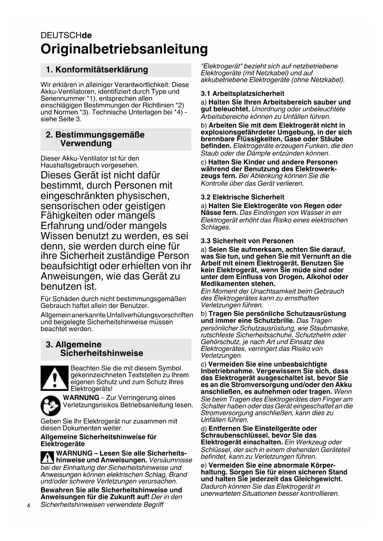 Wir erklären in alleiniger Verantwortlichkeit: Diese Akku-Ventilatoren, identifiziert durch Type und Seriennummer 1), entsprechen allen einschlädigen Bestimmungen der Richtlinien 2) und Normen 3). Technische Unterlagen bei 4) - siehe Seite 3.