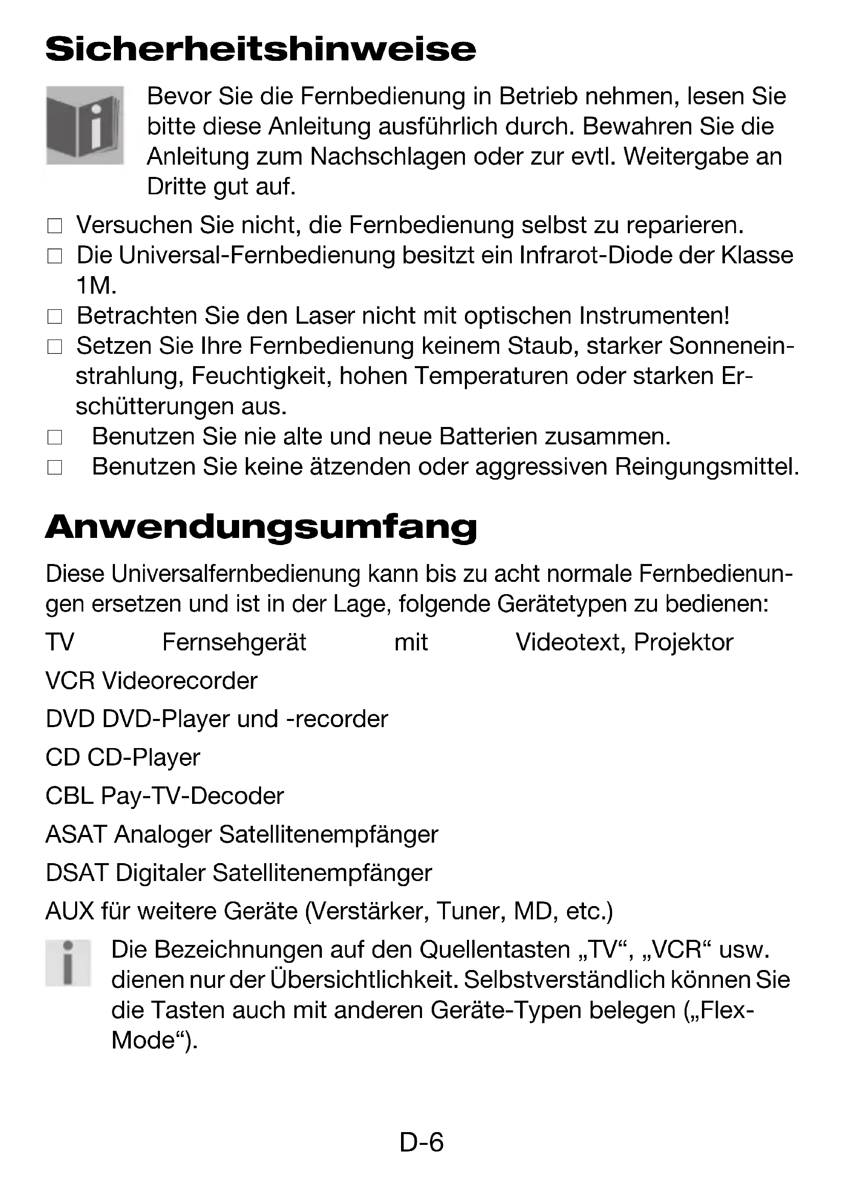 - Technische Daten Universal-FB MD 80383 BE.book Seite 5 Donnerstag, 4. August 2005 5:39 17D-6 Sicherheitshinweise Bevor Sie die Fernbedienung in Betrieb nehmen, lesen Sie bitte diese Anleitung ausführlich durch. Bewahren Sie die Anleitung zum Nachschlagen oder zur evtl. Weitergabe an Dritte gut auf. Versuchen Sie nicht, die Fernbedienung selbst zu reparieren. Die Universal-Fernbedienung besitzt ein Infrarot-Diode der Klasse 1M. Betrachten Sie den Laser nicht mit optischen Instrumenten! Setzen Sie Ihre Fernbedienung keinem Staub, starker Sonnenein- strahlung, Feuchtigkeit, hohen Temperaturen oder starken Er- schütterungen aus. Benutzen Sie nie alte und neue Batterien zusammen. Benutzen Sie keine ätzenden oder aggressiven Reingungsmittel. Anwendungsumfang Diese Universalfernbedienung kann bis zu acht normale Fernbedienun- gen ersetzen und ist in der Lage, folgende Gerätetypen zu bedienen: TV Fernsehgerät mit Videotext, Projektor VCR Videorecorder DVD DVD-Player und -recorder CD CD-Player CBL Pay-TV-Decoder ASAT Analoger Satellitenempfänger DSAT Digitaler Satellitenempfänger AUX für weitere Geräte (Verstärker, Tuner, MD, etc.) Die Bezeichnungen auf den Quellentasten „TV“, „VCR“ usw. dienen nur der Übersichtlichkeit. Selbstverständlich können Sie die Tasten auch mit anderen Geräte-Typen belegen („Flex- Mode“). Universal-FB MD 80383 BE.book Seite 6 Donnerstag, 4. August 2005 5:39 17D-7 p. 25