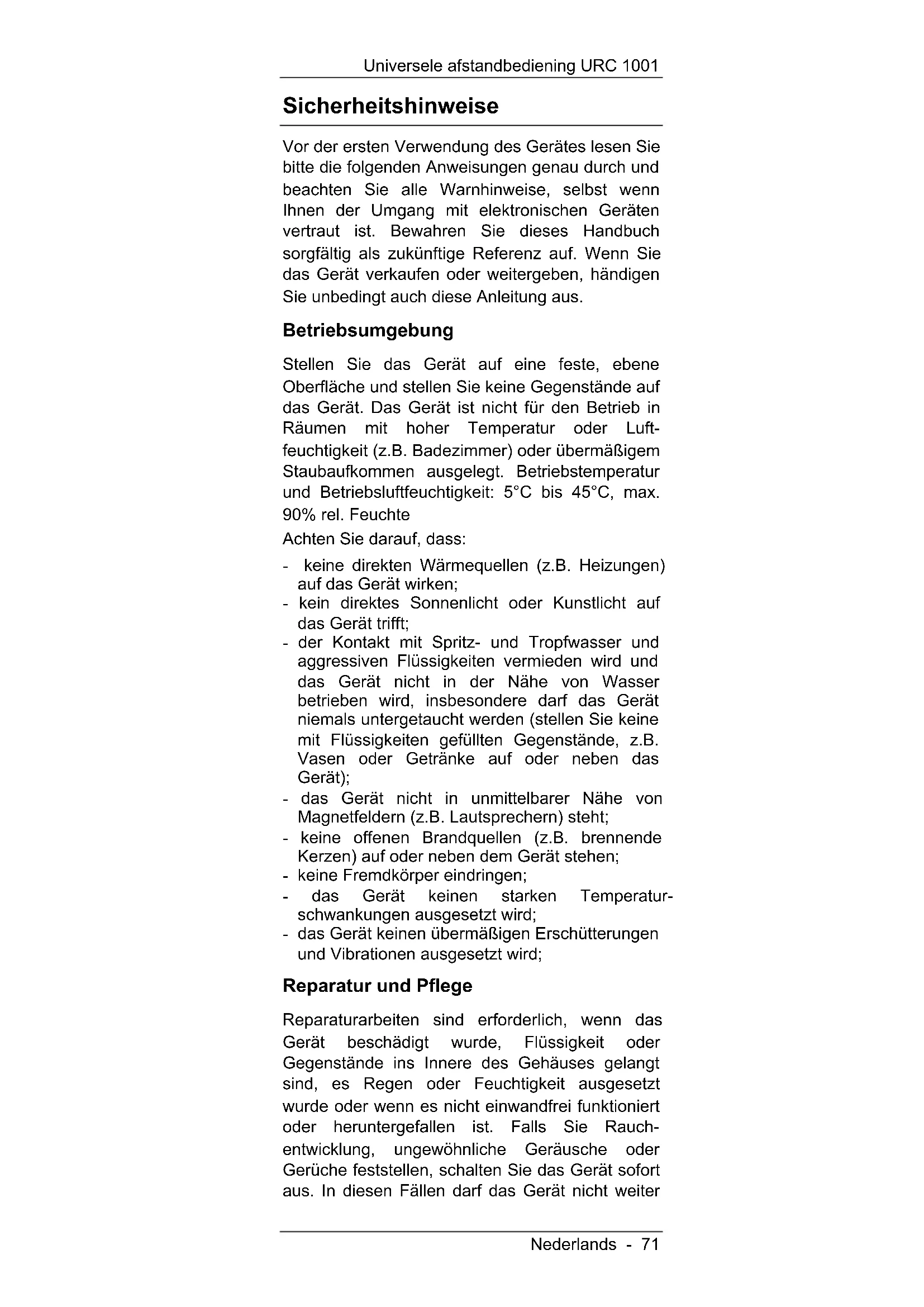 - Gerätecodes Universele afstandbediening URC 1001 Nederlands - 71 Sicherheitshinweise Vor der ersten Verwendung des Gerätes lesen Sie bitte die folgenden Anweisungen genau durch und beachten Sie alle Warnhinweise, selbst wenn Ihnen der Umgang mit elektronischen Geräten vertraut ist. Bewahren Sie dieses Handbuch sorgfältig als zukünftige Referenz auf. Wenn Sie das Gerät verkaufen oder weitergeben, händigen Sie unbedingt auch diese Anleitung aus. Betriebsumgebung Stellen Sie das Gerät auf eine feste, ebene Oberfläche und stellen Sie keine Gegenstände auf das Gerät. Das Gerät ist nicht für den Betrieb in Räumen mit hoher Temperatur oder Luft- feuchtigkeit (z.B. Badezimmer) oder übermäßigem Staubaufkommen ausgelegt. Betriebstemperatur und Betriebsluftfeuchtigkeit: 5°C bis 45°C, max. 90% rel. Feuchte Achten Sie darauf, dass: - keine direkten Wärmequellen (z.B. Heizungen) auf das Gerät wirken; - kein direktes Sonnenlicht oder Kunstlicht auf das Gerät trifft; - der Kontakt mit Spritz- und Tropfwasser und aggressiven Flüssigkeiten vermieden wird und das Gerät nicht in der Nähe von Wasser betrieben wird, insbesondere darf das Gerät niemals untergetaucht werden (stellen Sie keine mit Flüssigkeiten gefüllten Gegenstände, z.B. Vasen oder Getränke auf oder neben das Gerät); - das Gerät nicht in unmittelbarer Nähe von Magnetfeldern (z.B. Lautsprechern) steht; - keine offenen Brandquellen (z.B. brennende Kerzen) auf oder neben dem Gerät stehen; - keine Fremdkörper eindringen; - das Gerät keinen starken Temperatur- schwankungen ausgesetzt wird; - das Gerät keinen übermäßigen Erschütterungen und Vibrationen ausgesetzt wird; Reparatur und Pflege Reparaturarbeiten sind erforderlich, wenn das Gerät beschädigt wurde, Flüssigkeit oder Gegenstände ins Innere des Gehäuses gelangt sind, es Regen oder Feuchtigkeit ausgesetzt wurde oder wenn es nicht einwandfrei funktioniert oder heruntergefallen ist. Falls Sie Rauch- entwicklung, ungewöhnliche Geräusche oder Gerüche feststellen, schalten Sie das Gerät sofort aus. In diesen Fällen darf das Gerät nicht weiterUniversele afstandbediening URC 1001 p. 103