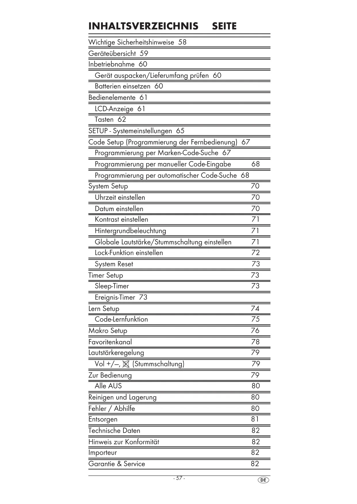 - Dank de batterijen en accu's alleen in een ontladen toe- stand af. Voer alle verpakkingsmaterialen op een milieuvriende- lijke manier af. Technische gegevens Bestuurbare apparaten: 10 Afmetingen L x B x H: 217 x 50 x 22 mm Gewicht : 102 g (zonder batterijen) Infrarood-LED: Laserklasse 1 Stroomvoorziening batterij: 2 x 1,5 V type AAA/LR03 (Micro) (inbegrepen in de levering) Bedrijfstemperatuur : + 5 – +35°C Opslagtemperatuur : -20 - +50 °C Vochtigheid: 5 - 90 % (geen condensatie) Opmerking over de conformiteit Dit apparaat voldoet met betrekking tot overeenstemming met de fundamentele eisen en de andere relevante voor- schriften aan de EMV-richtlijn 2004/108/EC. Importeur KOMPERNASS GMBH BURGSTRASSE 21 44867 BOCHUM, GERMANY www.kompernass.com Garantie & service U heeft op dit apparaat 3 jaar garantie vanaf de aan- koopdatum. Het apparaat is met de grootst mogelijke zorg vervaardigd en voorafgaand aan de levering nauwkeurig gecontroleerd. Bewaar a.u.b. de kassabon als aankoopbe- wijs. Mocht u aanspraak willen maken op de garantie, neem dan telefonisch contact op met uw serviceadres. Alleen op die manier is een kostenloze verzending van uw product ge- garandeerd. De garantie geldt uitsluitend voor materiaal- of fabricage- fouten, niet voor aan slijtage onderhevige delen of voor beschadigingen van breekbare onderdelen, bijv. schakelaars of accu’s. BDA_KH 2159 - DT-53628_nl.indd 54 30.06.2010 14:40:03- 55 - Het product is uitsluitend bestemd voor privé-gebruik en niet voor bedrijfsmatige doeleinden. Bij verkeerd gebruik en ondeskundige behandeling, bij gebruik van geweld en bij reparaties die niet door ons geautoriseerd serviceliaal zijn uitgevoerd, vervalt de garantie. Uw wettelijke rechten worden door deze garantie niet be- perkt. De garantieperiode wordt niet verlengd door de aansprake- lijkheid. Dit geldt eveneens voor vervangen en gerepareerde onderdelen. Eventuele schaden en gebreken die reeds bij de koop aanwezig zijn moeten direct na het uitpakken worden gemeld , uiterlijk echter twee dagen na datum van aankoop. Na aoop van de garantieperiode worden alle reparaties die optreden in rekening gebracht. Kompernass Service Netherland Tel.: 0900 1240001 E-mail: support.nl@kompernass.com Kompernaß Service Belgium Tél.: 0703 503 15 e-mail : support.be@kompernass.com BDA_KH 2159 - DT-53628_nl.indd 55 30.06.2010 14:40:04- 56 - BDA_KH 2159 - DT-53628_nl.indd 56 30.06.2010 14:40:04- 57 - INHALTSVERZEICHNIS SEITE Wichtige Sicherheitshinweise 58 Geräteübersicht 59 Inbetriebnahme 60 Gerät auspacken/Lieferumfang prüfen 60 Batterien einsetzen 60 Bedienelemente 61 LCD-Anzeige 61 Tasten 62 SETUP - Systemeinstellungen 65 Code Setup (Programmierung der Fernbedienung) 67 Programmierung per Marken-Code-Suche 67 Programmierung per manueller Code-Eingabe 68 Programmierung per automatischer Code-Suche 68 System Setup 70 Uhrzeit einstellen 70 Datum einstellen 70 Kontrast einstellen 71 Hintergrundbeleuchtung 71 Globale Lautstärke/Stummschaltung einstellen 71 Lock-Funktion einstellen 72 System Reset 73 Timer Setup 73 Sleep-Timer 73 Ereignis-Timer 73 Lern Setup 74 Code-Lernfunktion 75 Makro Setup 76 Favoritenkanal 78 Lautstärkeregelung 79 Vol +/—, (Stummschaltung) 79 Zur Bedienung 79 Alle AUS 80 Reinigen und Lagerung 80 Fehler / Abhilfe 80 Entsorgen 81 Technische Daten 82 Hinweis zur Konformität 82 Importeur 82 Garantie & Service 82 BDA_KH 2159 - DT-53628_de.indd 57 30.06.2010 14:42:02- 58 - UNIVERSALFERNBEDIENUNG KH2159 Diese Dokumentation ist urheberrechtlich geschützt. Alle Rechte, auch die der fotomechanischen Wiedergabe, der Vervielfältigung und der Verbreitung mittels besonderer Ver- fahren (zum Beispiel Datenverarbeitung, Datenträger und Datennetze), auch teilweise, sowie inhaltliche und technische Änderungen vorbehalten. Lesen Sie die Bedienungsanleitung vor der ersten Verwen- dung aufmerksam durch und heben Sie diese für den späte- ren Gebrauch auf. Händigen Sie bei Weitergabe des Gerä- tes an Dritte auch die Anleitung aus. Wichtige Sicherheitshinweise Bestimmungsgemäße Verwendung Kinder dürfen die Fernbedienung nur unter Aufsicht von Er- wachsenen bedienen. Die Universalfernbedienung kann maximal zehn Fernbedie- nungen ersetzen. Sie kann nur für Geräte der Unterhaltungs- elektronik mit einem Infrarot-Empfänger eingesetzt werden. Die Funktionen der Universalfernbedienung entsprechen im Wesentlichen denen der Originalfernbedienungen. Die Uni- versalfernbedienung ist für den privaten Gebrauch bestimmt. Sie ist nicht für eine gewerbliche Nutzung geeignet. Jede andere Verwendung gilt als nicht bestimmungsgemäß. Für Schäden aufgrund nicht bestimmungsgemäßer Verwen- dung oder eigenmächtiger Umbauten übernimmt der Herstel- ler keine Haftung. Warnung Ein Warnhinweis dieser Gefahrenstufe kennzeichnet eine mögliche gefährliche Situation. Falls die gefährliche Situation nicht vermieden wird, kann dies zu Verletzungen führen. Die Anweisungen in diesem Warnhinweis befolgen, um Verlet- zungen von Personen zu vermeiden. Achtung Ein Warnhinweis dieser Gefahrenstufe kennzeichnet einen mög- lichen Sachschaden. Falls die Situation nicht vermieden wird, kann dies zu Sachschäden führen. Die Anweisungen in die- sem Warnhinweis befolgen, um Sachschäden zu vermeiden. Hinweis Ein Hinweis kennzeichnet zusätzliche Informationen, die den Umgang mit dem Gerät erleichtern. Warnung vor Verletzungsgefahr durch falschen Umgang mit Batterien! Batterien müssen mit besonderer Vorsicht behandelt werden. Beachten Sie folgende Sicherheitshinweise: