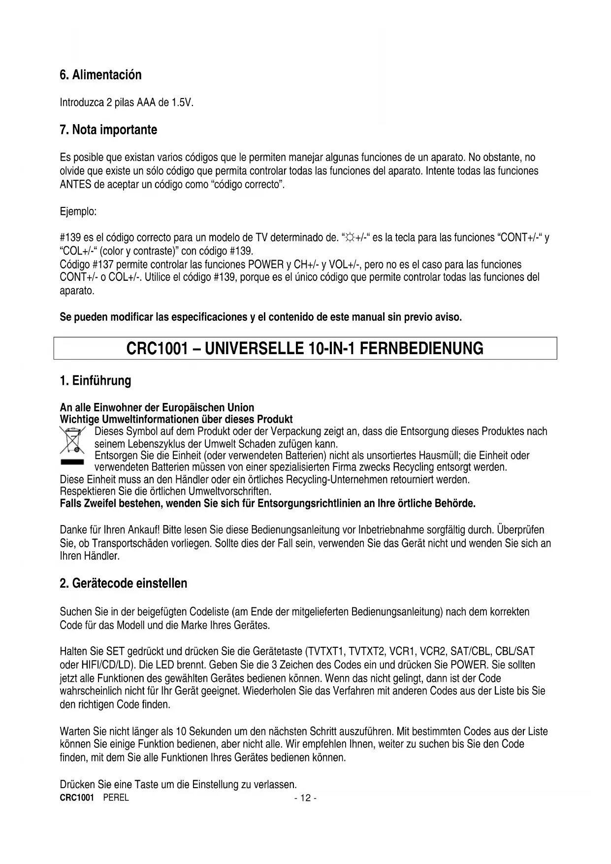 Es posible que existan various@cuidos que le permiten manegaralgunasfunidadesde unaparato.Noobstante,no olvide que existe un solo@cuidoquepermitacontrolalasfunidadesdelaparato.Intente todaslasfunrientes ANTES de acceptar un@cuido como"cuido correcto". Ejempio: #139 es el número correcto para un modelo de TV determinado de. 12 +12 - es la tecla para las unidades "CONT+/-" y "COL + / - (color y contraste)" con número #139. Códio #137 permite controlar las functions POWER y CH+/- y VOL+/-, pero no es el caso para lasmericanas CONT+/- o COL+/-. Utilice el número #139, porque es el único número que permite controlar todas lasmericanas del aparato. Se pueda modifier las specifications y el contenido de este manual sin previo aviso.CRC1001 - UNIVERSELLE 10-IN-1 FERNBEDIENUNG
