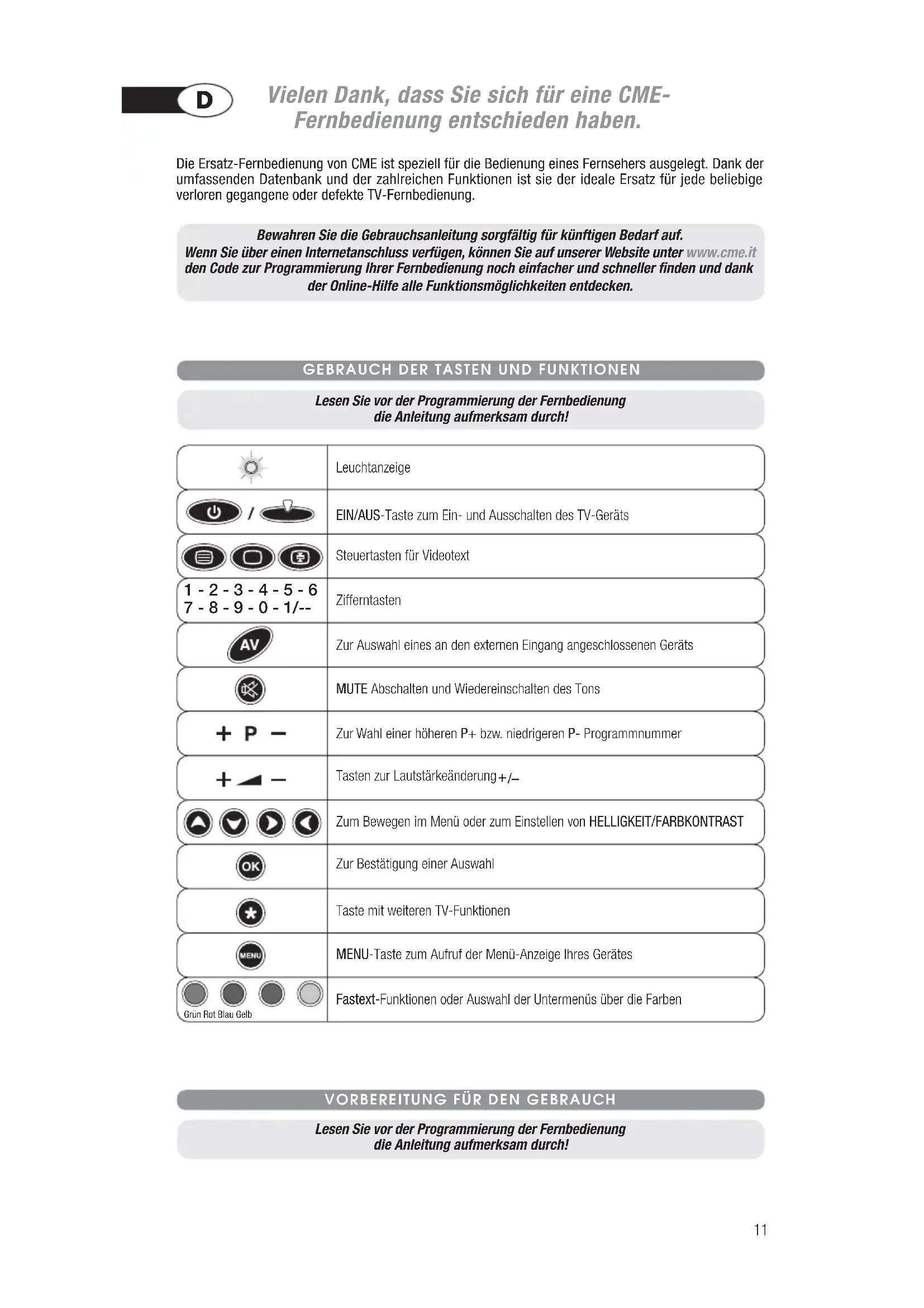 Besuchen Sie unsere Website unter www.cme.it. So können Sie die Fernbedienung am schnellsten und einfachsten programmieren.14