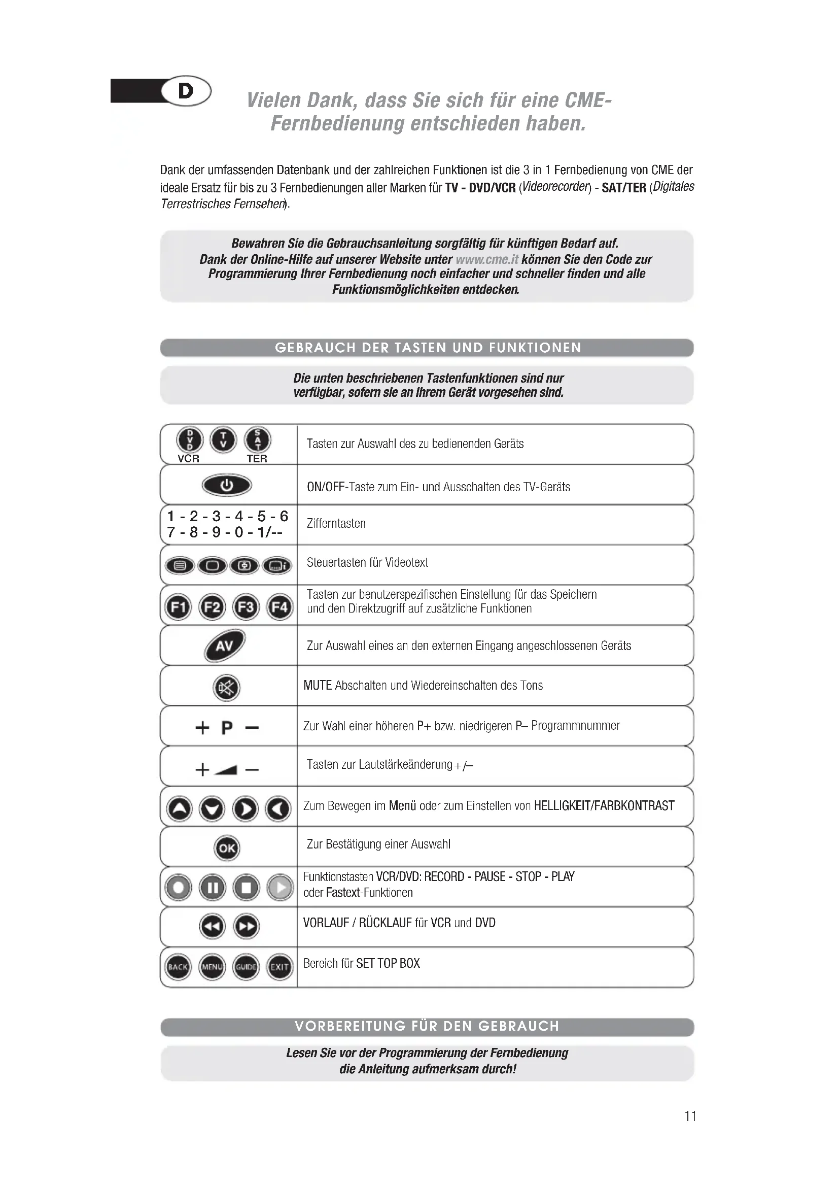 Die unten beschriebenen Tastenfunktionen sind nur verfügbar, sofern sie an Ihrem Gerät vorgesehen sind. Bewahren Sie die Gebrauchsanleitung sorgfältig für künftigen Bedarf auf. Dank der Online-Hilfe auf unserer Website unter www.cme.it können Sie den Code zur Programmierung Ihrer Fernbedienung noch einfacher und schneller finden und alle Funktionsmöglichkeiten entdecken