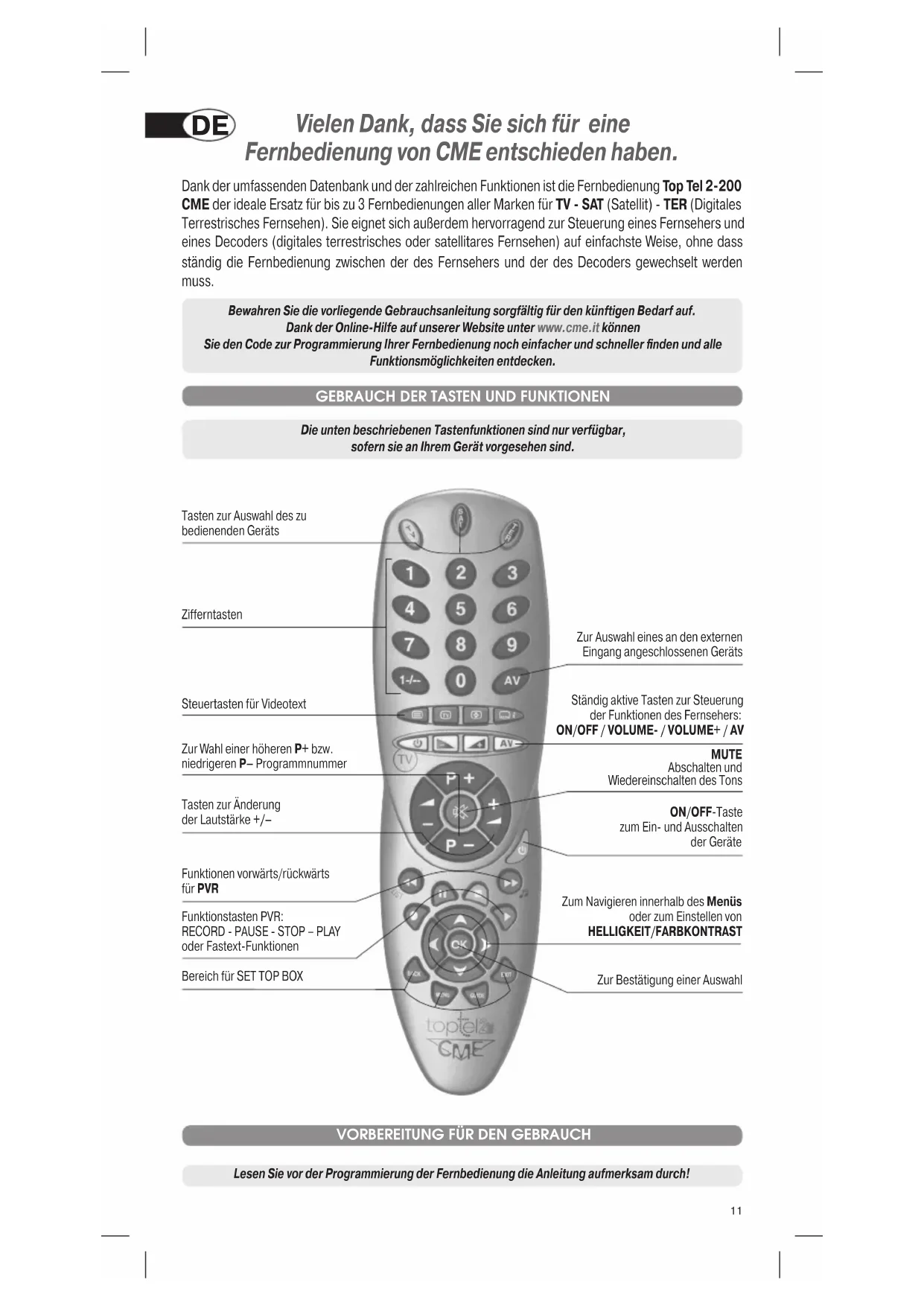 - consult the website www.cme.it where you can quickly and easily fi nd all the answers you need. 2-year WARRANTY The warranty ceases to be valid if the product is tampered with or used incorrectly. Purchase date Dealer's stamp The symbol of a bin crossed out on the appliance indicates that the product at the end of its life cycle should be disposed of separately from other refuse. The user will, therefore, have to hand over the appliance at the end of its life cycle to a proper recycling centre for electronic and electrotechnical refuse, or give it over to the seller each time a new, similar appliance is purchased. Proper separate refuse collecting for the later initiation of the appliance sent for recycling, treatment and environmentally friendly disposal, contributes to reducing negative effects on the environment and on our health and encourages the recycling of the material used to make it. Make of appliance Type Model Mod. original remote control Brand code es: THOMSON TV 25DU78M RCT 4000 1007 In case of need, you can write to customer assistance at telecomandi@cme.it. Enter the important information regarding your appliances in the table below and have this information ready in order to help us assist you more quickly: Model of CME remote control: _______________ (see body of remote control)11 Vielen Dank, dass Sie sich für eine Fernbedienung von CME entschieden haben. Dank der umfassenden Datenbank und der zahlreichen Funktionen ist die Fernbedienung Top Tel 2-200 CME der ideale Ersatz für bis zu 3 Fernbedienungen aller Marken für TV - SAT (Satellit) - TER (Digitales Terrestrisches Fernsehen). Sie eignet sich außerdem hervorragend zur Steuerung eines Fernsehers und eines Decoders (digitales terrestrisches oder satellitares Fernsehen) auf einfachste Weise, ohne dass ständig die Fernbedienung zwischen der des Fernsehers und der des Decoders gewechselt werden muss. Bewahren Sie die vorliegende Gebrauchsanleitung sorgfältig für den künftigen Bedarf auf. Dank der Online-Hilfe auf unserer Website unter www.cme.it können Sie den Code zur Programmierung Ihrer Fernbedienung noch einfacher und schneller fi nden und alle Funktionsmöglichkeiten entdecken.