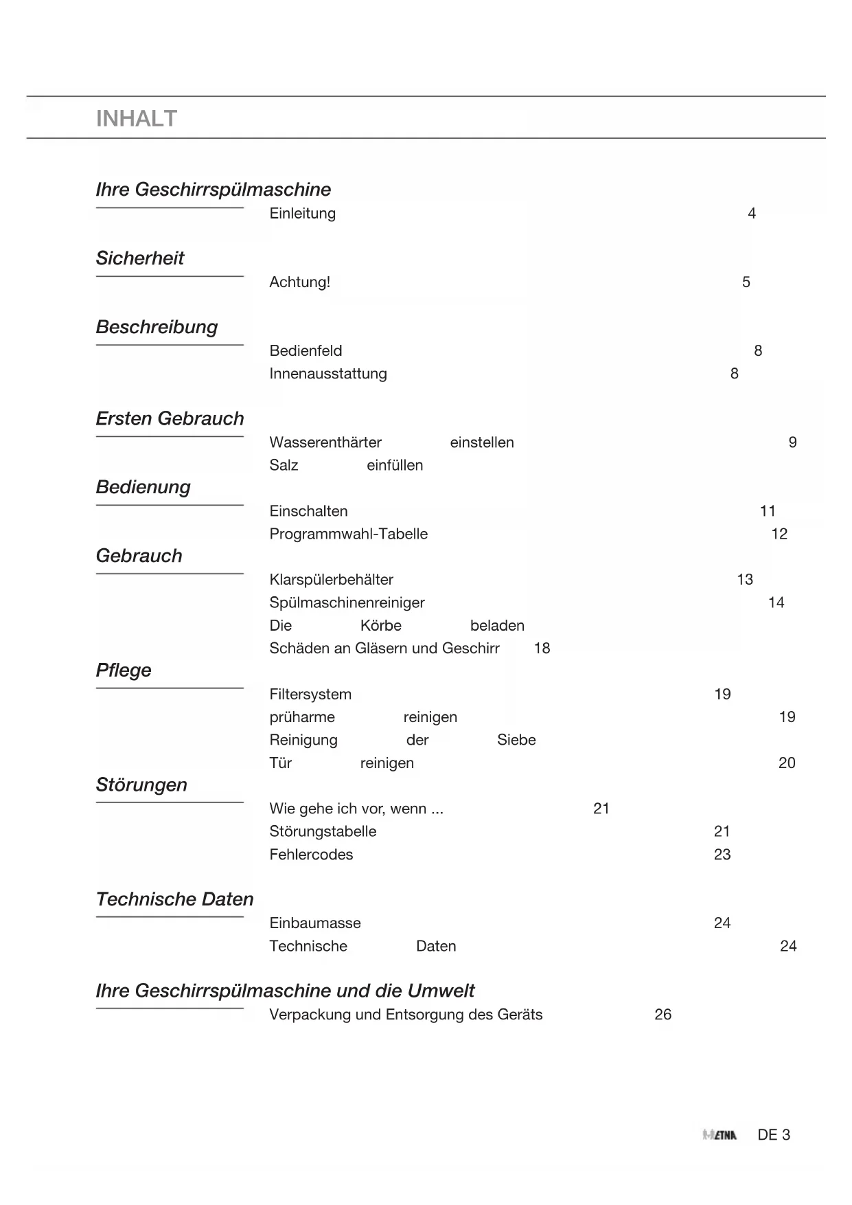 INHALT Ihre Geschirrspülmaschine Einleitung 4 Sicherheit Achtung! 5 Beschreibung Bedienfeld 8 Innenausstattung 8 Ersten Gebrauch Wasserenthärter einstellen 9 Salz einfüllen 10 Bedienung Einschalten 11 Programmwahl-Tabelle 12 Gebrauch Klarspülerbehälter 13 Spülmaschinenreiniger 14 Die Körbe beladen 16 Schäden an Gläsern und Geschirr 18 Pflege Filtersystem 19 prüharme reinigen 19 Reinigung der Siebe 19 Tür reinigen 20 Störungen Wie gehe ich vor, wenn ... 21 Störungstabelle 21 Fehlercodes 23 Technische Daten Einbaumasse 24 Technische Daten 24 Ihre Geschirrspülmaschine und die Umwelt Verpackung und Entsorgung des Geräts 26DE 4 Einleitung Sie haben sich für eine Geschirrspülmaschine von Etna entschieden. Ein optimaler Anwendungskomfort und eine einfache Bedienung standen bei der Entwicklung dieses Produktes an erster Stelle. In dieser Anleitung wird beschrieben, wie Sie die Geschirrspülmaschine optimal nutzen. Hier finden Sie Informationen zur Bedienung und Hintergrundinformationen zur Funktionsweise des Geräts. Daneben erhalten Sie Tipps zur Pflege des Geräts. Die für die Installation relevanten Sicherheitsvorschriften sind in der Installationsvorschrift angegeben, die für den Installateur gedacht ist. Lesen Sie bitte diese Bedienungsanleitung, bevor Sie das Gerät verwenden. Bewahren Sie sie sorgfältig auf, damit sich auch eventuelle weitere Benutzer über das Gerät informieren können