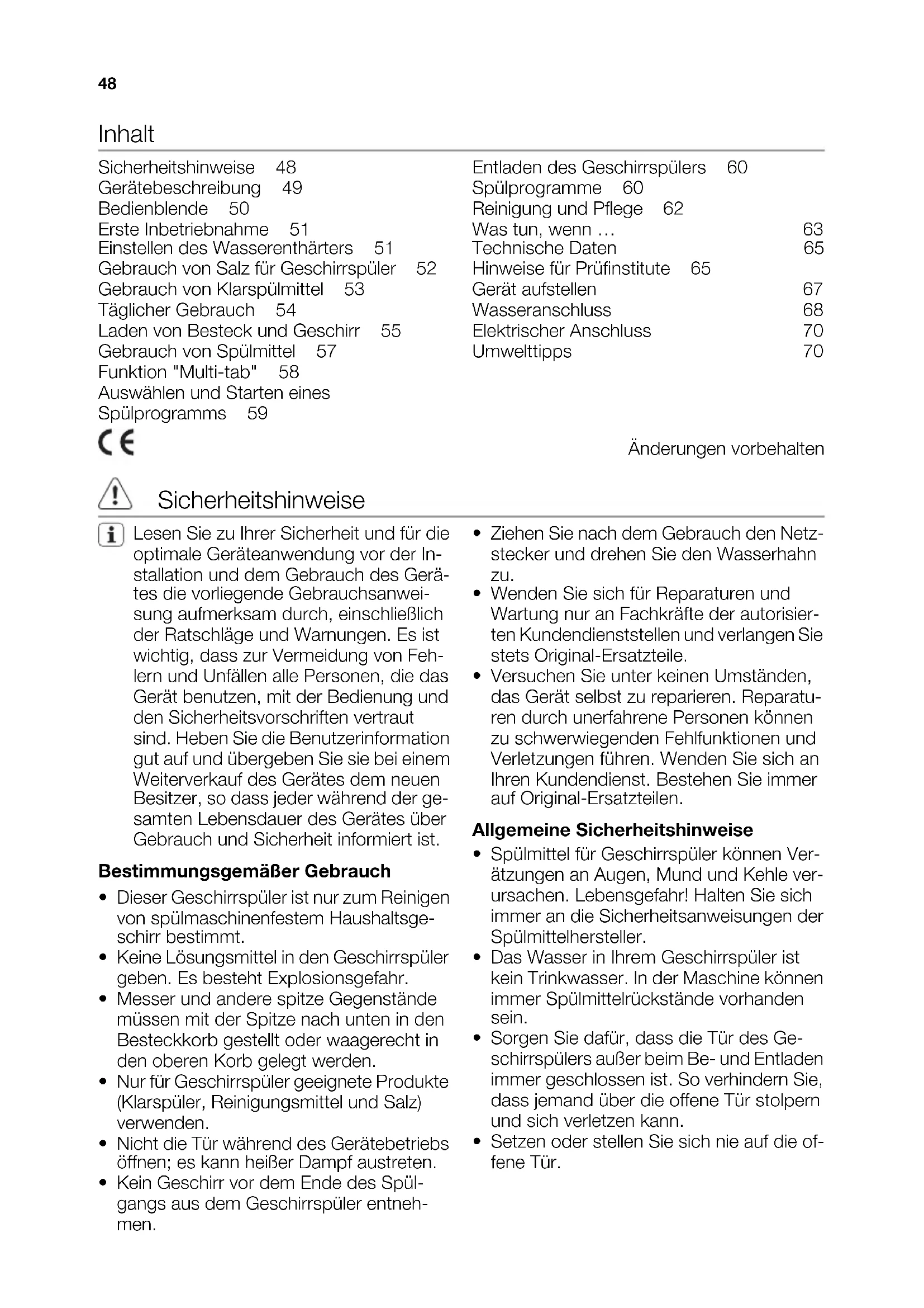 - Éliminez le loquet de la porte, cela évi- tera aux enfants de s'enfermer dans l'appareil et de mettre ainsi leur vie en danger. 47Inhalt Sicherheitshinweise 48 Gerätebeschreibung 49 Bedienblende 50 Erste Inbetriebnahme 51 Einstellen des Wasserenthärters 51 Gebrauch von Salz für Geschirrspüler 52 Gebrauch von Klarspülmittel 53 Täglicher Gebrauch 54 Laden von Besteck und Geschirr 55 Gebrauch von Spülmittel 57 Funktion "Multi-tab" 58 Auswählen und Starten eines Spülprogramms 59 Entladen des Geschirrspülers 60 Spülprogramme 60 Reinigung und Pflege 62 Was tun, wenn … 63 Technische Daten 65 Hinweise für Prüfinstitute 65 Gerät aufstellen 67 Wasseranschluss 68 Elektrischer Anschluss 70 Umwelttipps 70 Änderungen vorbehalten Sicherheitshinweise Lesen Sie zu Ihrer Sicherheit und für die optimale Geräteanwendung vor der In- stallation und dem Gebrauch des Gerä- tes die vorliegende Gebrauchsanwei- sung aufmerksam durch, einschließlich der Ratschläge und Warnungen. Es ist wichtig, dass zur Vermeidung von Feh- lern und Unfällen alle Personen, die das Gerät benutzen, mit der Bedienung und den Sicherheitsvorschriften vertraut sind. Heben Sie die Benutzerinformation gut auf und übergeben Sie sie bei einem Weiterverkauf des Gerätes dem neuen Besitzer, so dass jeder während der ge- samten Lebensdauer des Gerätes über Gebrauch und Sicherheit informiert ist. Bestimmungsgemäßer Gebrauch