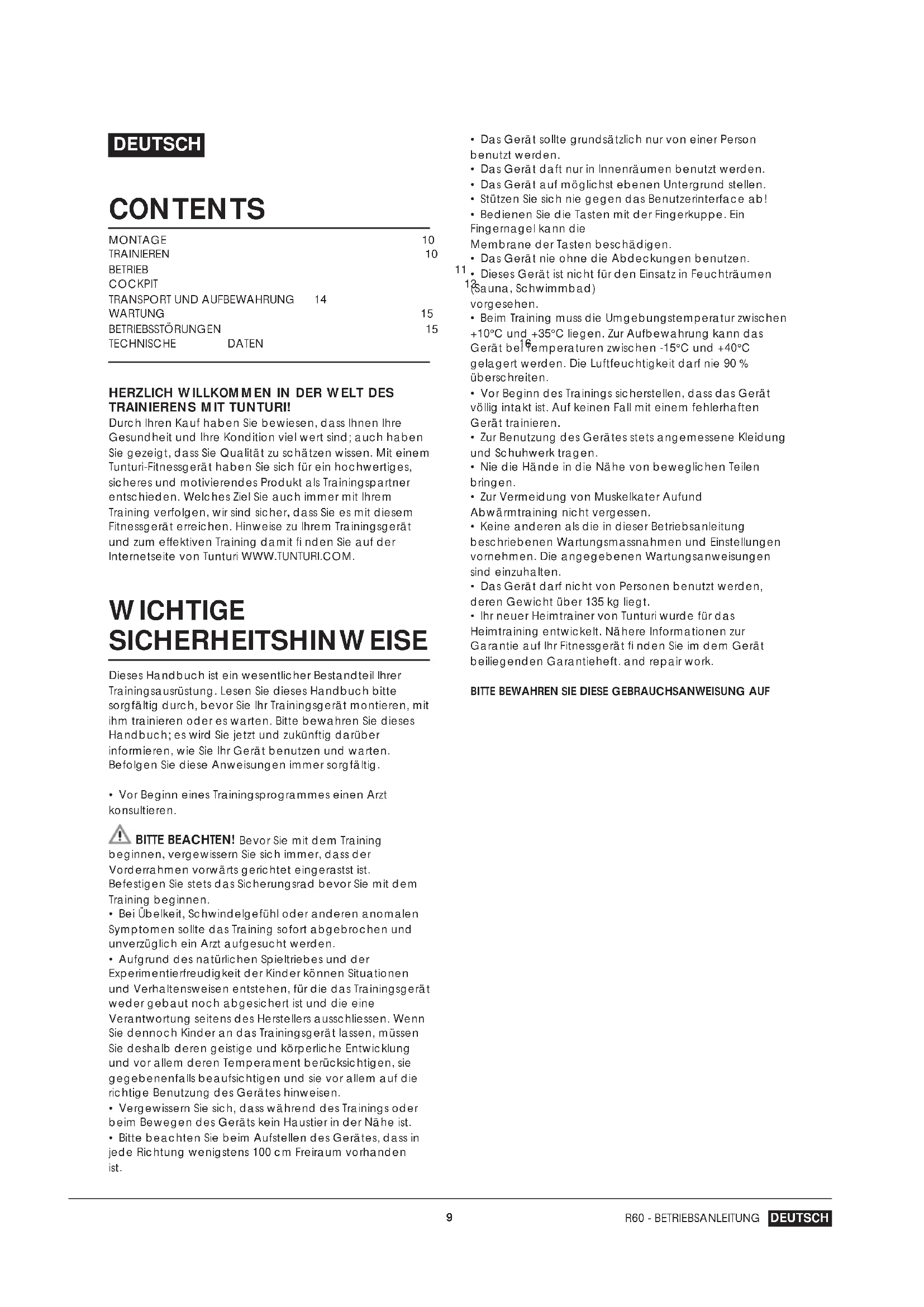 TRAINIERENS MIT TUNTURI! Durch Ihren Kauf haben Sie bewiesen, dass Ihnen Ihre Gesundheit und Ihre Kondition viel wert sind; auch haben Sie gezeigt, dass Sie Qualität zu schätzen wissen. Mit einemTunturi-Fitnessgerät haben Sie sich für ein hochwertiges, sicheres und motivierendes Produkt als Trainingspartner entschieden. Welches Ziel Sie auch immer mit IhremTraining verfolgen, wir sind sicher, dass Sie es mit diesem Fitnessgerät erreichen. Hinweise zu Ihrem Trainingsgerät und zum effektiven Training damit fi nden Sie auf der Internetseite von Tunturi WWW.TUNTURI.COM. WICHTIGE SICHERHEITSHINWEISE Dieses Handbuch ist ein wesentlicher Bestandteil Ihrer Trainingsausrüstung. Lesen Sie dieses Handbuch bittesorgfältig durch, bevor Sie Ihr Trainingsgerät montieren, mit ihm trainieren oder es warten. Bitte bewahren Sie dieses Handbuch; es wird Sie jetzt und zukünftig darüberinformieren, wie Sie Ihr Gerät benutzen und warten. Befolgen Sie diese Anweisungen immer sorgfältig.• Vor Beginn eines Trainingsprogrammes einen Arzt konsultieren. BITTE BEACHTEN! Bevor Sie mit dem Training beginnen, vergewissern Sie sich immer, dass der Vorderrahmen vorwärts gerichtet eingerastst ist. Befestigen Sie stets das Sicherungsrad bevor Sie mit dem Training beginnen.• Bei Übelkeit, Schwindelgefühl oder anderen anomalen Symptomen sollte das Training sofort abgebrochen undunverzüglich ein Arzt aufgesucht werden.• Aufgrund des natürlichen Spieltriebes und der Experimentierfreudigkeit der Kinder können Situationen und Verhaltensweisen entstehen, für die das Trainingsgerät weder gebaut noch abgesichert ist und die eineVerantwortung seitens des Herstellers ausschliessen. Wenn Sie dennoch Kinder an das Trainingsgerät lassen, müssen Sie deshalb deren geistige und körperliche Entwicklung und vor allem deren Temperament berücksichtigen, siegegebenenfalls beaufsichtigen und sie vor allem auf die richtige Benutzung des Gerätes hinweisen.• Vergewissern Sie sich, dass während des Trainings oder beim Bewegen des Geräts kein Haustier in der Nähe ist.• Bitte beachten Sie beim Aufstellen des Gerätes, dass in jede Richtung wenigstens 100 cm Freiraum vorhanden ist.