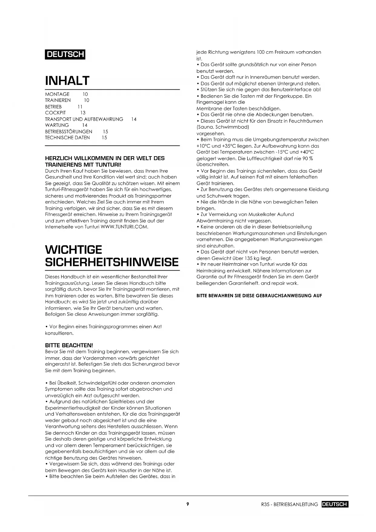 - Das Gerät sollte grundsätzlich nur von einer Person benutzt werden.• Das Gerät daft nur in Innenräumen benutzt werden.• Das Gerät auf möglichst ebenen Untergrund stellen.• Stützen Sie sich nie gegen das Benutzerinterface ab!• Bedienen Sie die Tasten mit der Fingerkuppe. Ein Fingernagel kann dieMembrane der Tasten beschädigen.• Das Gerät nie ohne die Abdeckungen benutzen.• Dieses Gerät ist nicht für den Einsatz in Feuchträumen (Sauna, Schwimmbad)vorgesehen.• Beim Training muss die Umgebungstemperatur zwischen +10°C und +35°C liegen. Zur Aufbewahrung kann das Gerät bei Temperaturen zwischen -15°C und +40°C gelagert werden. Die Luftfeuchtigkeit darf nie 90 % überschreiten.• Vor Beginn des Trainings sicherstellen, dass das Gerät völlig intakt ist. Auf keinen Fall mit einem fehlerhaften Gerät trainieren.• Zur Benutzung des Gerätes stets angemessene Kleidung und Schuhwerk tragen.• Nie die Hände in die Nähe von beweglichen Teilen bringen.• Zur Vermeidung von Muskelkater Aufund Abwärmtraining nicht vergessen. • Keine anderen als die in dieser Betriebsanleitung beschriebenen Wartungsmassnahmen und Einstellungen vornehmen. Die angegebenen Wartungsanweisungensind einzuhalten. • Das Gerät darf nicht von Personen benutzt werden, deren Gewicht über 135 kg liegt.• Ihr neuer Heimtrainer von Tunturi wurde für das Heimtraining entwickelt. Nähere Informationen zur Garantie auf Ihr Fitnessgerät nden Sie im dem Gerätbeiliegenden Garantieheft. and repair work. BITTE BEWAHREN SIE DIESE GEBRAUCHSANWEISUNG AUF DEUTSCH