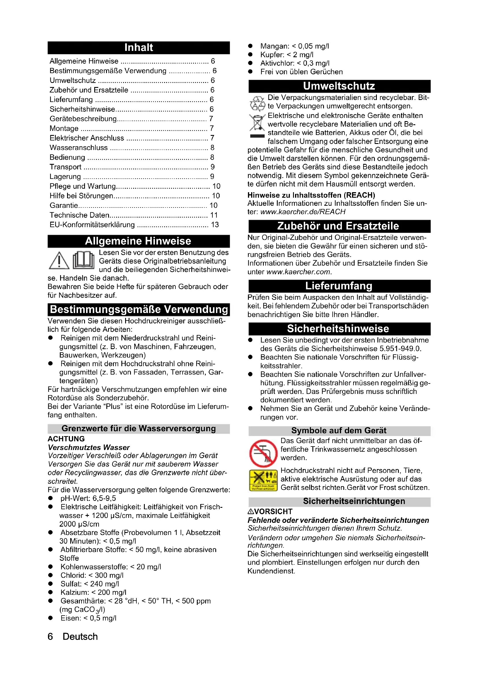 - /l) Eisen: < 0,5 mg/l Mangan: < 0,05 mg/l Kupfer: < 2 mg/l Aktivchlor: < 0,3 mg/l Frei von üblen Gerüchen Umweltschutz Die Verpackungsmaterialien sind recyclebar. Bit- te Verpackungen umweltgerecht entsorgen. Elektrische und elektronische Geräte enthalten wertvolle recyclebare Materialien und oft Be- standteile wie Batterien, Akkus oder Öl, die bei falschem Umgang oder falscher Entsorgung eine potentielle Gefahr für die menschliche Gesundheit und die Umwelt darstellen können. Für den ordnungsgemä- ßen Betrieb des Geräts sind diese Bestandteile jedoch notwendig. Mit diesem Symbol gekennzeichnete Gerä- te dürfen nicht mit dem Hausmüll entsorgt werden. Hinweise zu Inhaltsstoffen (REACH) Aktuelle Informationen zu Inhaltsstoffen finden Sie un- ter: www.kaercher.de/REACH Zubehör und Ersatzteile Nur Original-Zubehör und Original-Ersatzteile verwen- den, sie bieten die Gewähr für einen sicheren und stö- rungsfreien Betrieb des Geräts. Informationen über Zubehör und Ersatzteile finden Sie unter www.kaercher.com. Lieferumfang Prüfen Sie beim Auspacken den Inhalt auf Vollständig- keit. Bei fehlendem Zubehör oder bei Transportschäden benachrichtigen Sie bitte Ihren Händler. Sicherheitshinweise Lesen Sie unbedingt vor der ersten Inbetriebnahme des Geräts die Sicherheitshinweise 5.951-949.0. Beachten Sie nationale Vorschriften für Flüssig- keitsstrahler. Beachten Sie nationale Vorschriften zur Unfallver- hütung. Flüssigkeitsstrahler müssen regelmäßig ge- prüft werden. Das Prüfergebnis muss schriftlich dokumentiert werden. Nehmen Sie an Gerät und Zubehör keine Verände- rungen vor. Symbole auf dem Gerät Das Gerät darf nicht unmittelbar an das öf- fentliche Trinkwassernetz angeschlossen werden. Hochdruckstrahl nicht auf Personen, Tiere, aktive elektrische Ausrüstung oder auf das Gerät selbst richten.Gerät vor Frost schützen. Sicherheitseinrichtungen 몇 VORSICHT Fehlende oder veränderte Sicherheitseinrichtungen Sicherheitseinrichtungen dienen Ihrem Schutz. Verändern oder umgehen Sie niemals Sicherheitsein- richtungen. Die Sicherheitseinrichtungen sind werkseitig eingestellt und plombiert. Einstellungen erfolgen nur durch den Kundendienst. Allgemeine Hinweise p. 6