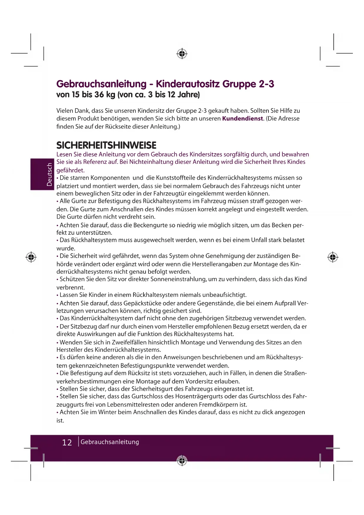 - Wenden Sie sich in Zweifelfällen hinsichtlich Montage und Verwendung des Sitzes an den Hersteller des Kinderrückhaltesystems.