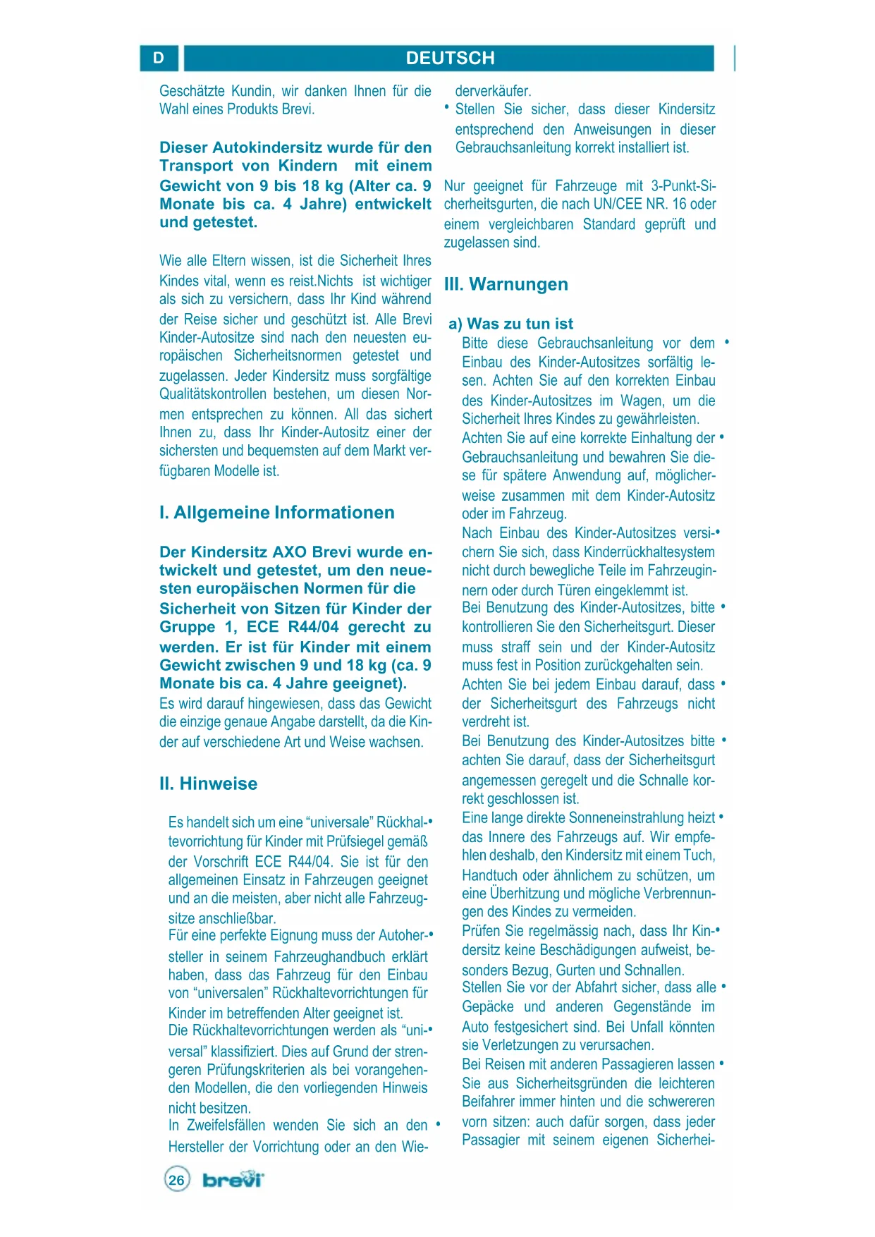 Geschätzte Kundin, wir danken Ihnen für die Wahl eines Produkts Brevi. Dieser Autokindersitz wurde für den Transport von Kindern mit einem Gewicht von 9 bis 18 kg (Alter ca. 9 Monate bis ca. 4 Jahre) entwickelt und getestet. Wie alle Eltern wissen, ist die Sicherheit Ihres Kindes vital, wenn es reist.Nichts ist wichtiger als sich zu versichern, dass Ihr Kind während der Reise sicher und geschützt ist. Alle Brevi Kinder-Autositze sind nach den neuesten eu- ropäischen Sicherheitsnormen getestet und zugelassen. Jeder Kindersitz muss sorgfältige Qualitätskontrollen bestehen, um diesen Nor- men entsprechen zu können. All das sichert Ihnen zu, dass Ihr Kinder-Autositz einer der sichersten und bequemsten auf dem Markt ver- fügbaren Modelle ist.