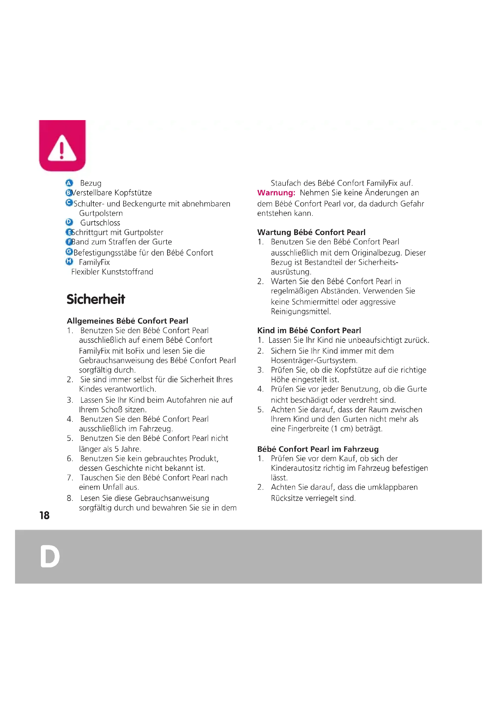 sorgfältig durch und bewahren Sie sie in dem Staufach des Bébé Confort FamilyFix auf. Warnung: Nehmen Sie keine Änderungen an dem Bébé Confort Pearl vor, da dadurch Gefahr entstehen kann. Wartung Bébé Confort Pearl
