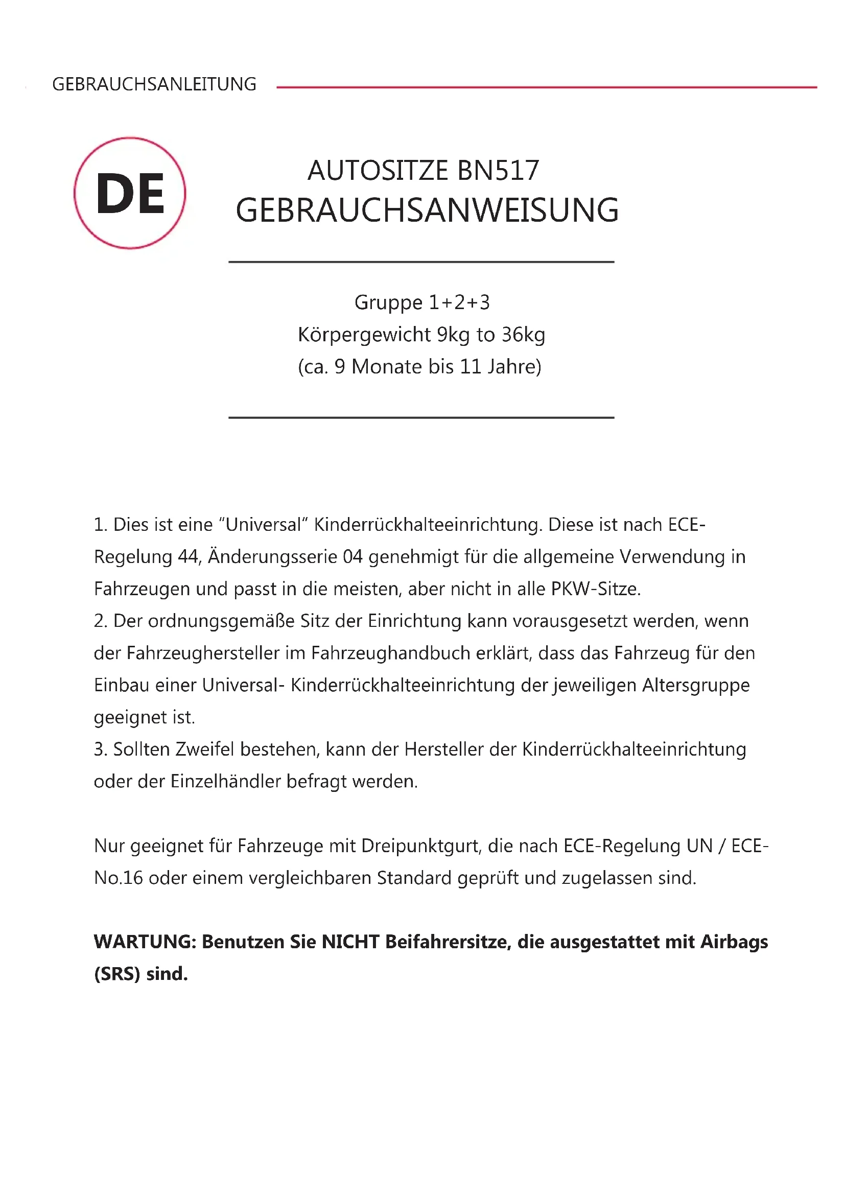 AUTOSITZE BN517 GEBRAUCHSANWEISUNG
