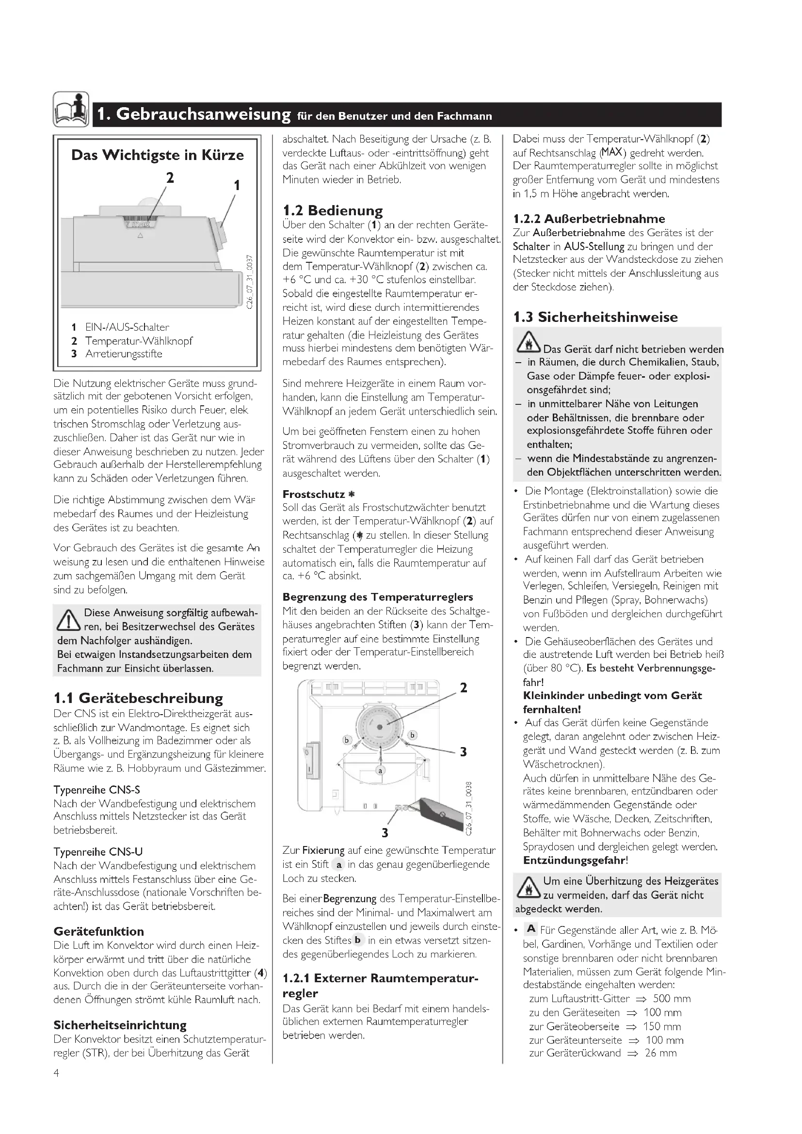Der CNS ist ein Elektro-Direktheizgerät aus- schließlich zur Wandmontage. Es eignet sich z. B. als Vollheizung im Badezimmer oder als Übergangs- und Ergänzungsheizung für kleinere Räume wie z. B. Hobbyraum und Gästezimmer. Typenreihe CNS-S Nach der Wandbefestigung und elektrischem Anschluss mittels Netzstecker ist das Gerät betriebsbereit. Typenreihe CNS-U Nach der Wandbefestigung und elektrischem Anschluss mittels Festanschluss über eine Ge- räte-Anschlussdose (nationale Vorschriften be- achten!) ist das Gerät betriebsbereit. Gerätefunktion Die Luft im Konvektor wird durch einen Heiz- körper erwärmt und tritt über die natürliche Konvektion oben durch das Luftaustrittgitter (4) aus. Durch die in der Geräteunterseite vorhan- denen Öffnungen strömt kühle Raumluft nach. Sicherheitseinrichtung Der Konvektor besitzt einen Schutztemperatur- regler (STR), der bei Überhitzung das Gerät Das Wichtigste in Kürze Dabei muss der Temperatur-Wählknopf (2) auf Rechtsanschlag ( MAX ) gedreht werden. Der Raumtemperaturregler sollte in möglichst großer Entfernung vom Gerät und mindestens in 1,5 m Höhe angebracht werden.