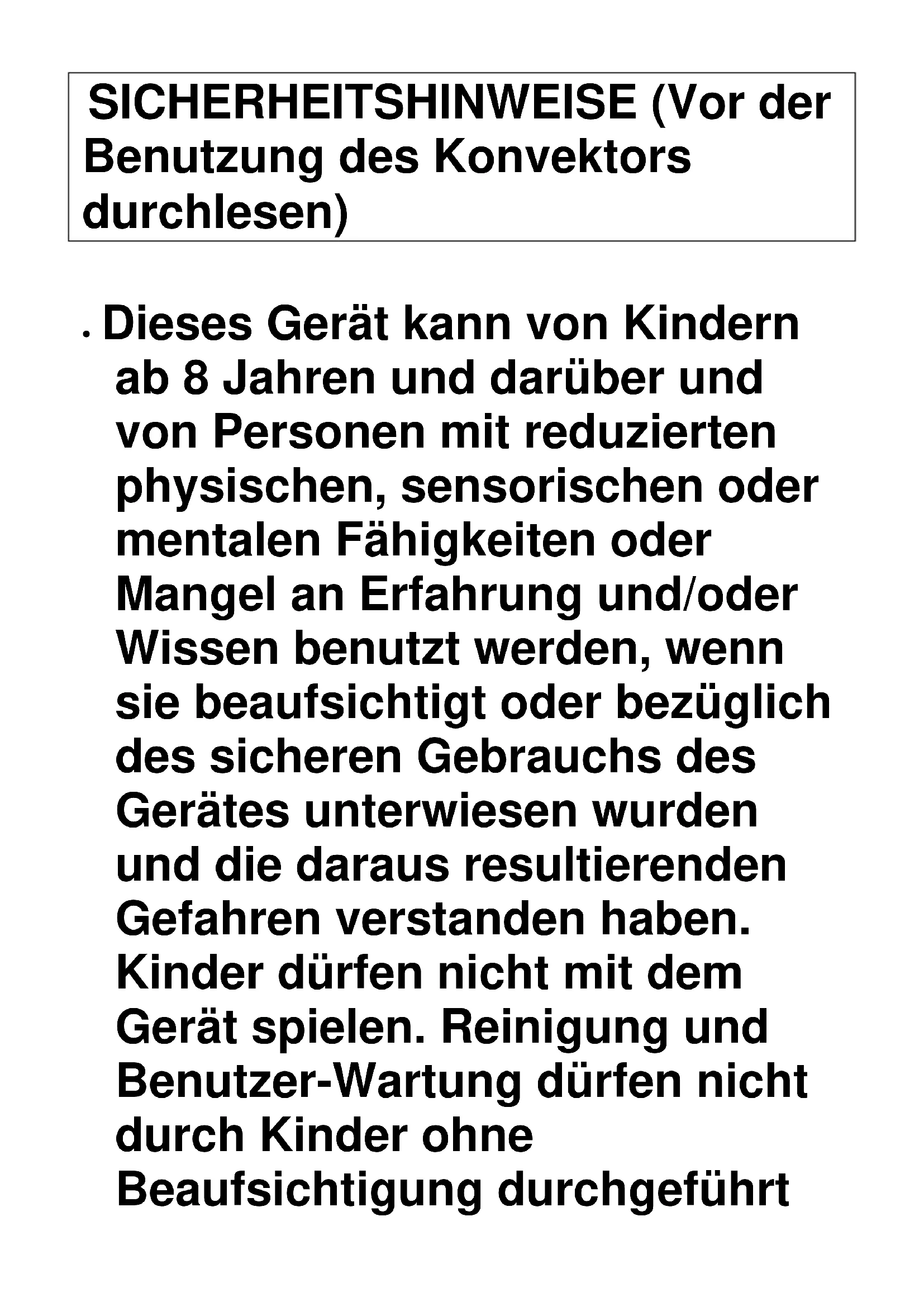 HEAT FLOW 2000/ 2010/ 2020/ 2050 Konvektor Bedienungsanleitung DESICHERHEITSHINWEISE (Vor der Benutzung des Konvektors durchlesen) Dieses Gerät kann von Kindern ab 8 Jahren und darüber und von Personen mit reduzierten physischen, sensorischen oder mentalen Fähigkeiten oder Mangel an Erfahrung und/oder Wissen benutzt werden, wenn sie beaufsichtigt oder bezüglich des sicheren Gebrauchs des Gerätes unterwiesen wurden und die daraus resultierenden Gefahren verstanden haben. Kinder dürfen nicht mit dem Gerät spielen. Reinigung und Benutzer-Wartung dürfen nicht durch Kinder ohne Beaufsichtigung durchgeführtwerden. Den Konvektor erst gebrauchen, wenn die Füße richtig angeschraubt sind. Garantieren Sie, dass der Stromanschluss an der Steckdose, in der der Konvektor angesteckt ist, dem Bemessungsetikett entspricht und dass die Steckdose eine Erdleitung hat. Das Netzkabel von dem heißen Konvektor fernhalten! Den Konvektor nie in der Nähe von Feuchträumen bzw. Wasserstellen platzieren, da dieser in die Badewanne oder andere Wasserbehälter fallen könnte. Den Konvektor nie im Freien benutzen. Das Wärmeabgangsgitter oder Luftaufnahmedurchbrüche desKonvektors nicht abdecken oder blockieren. Den Konvektor nicht auf einen Teppich mit weicher, haariger Oberfläche stellen. Garantieren Sie immer, dass der Konvektor auf einer stabilen, aufrechten Fläche gelegt wird, dass der Konvektor nicht in der Nähe von Vorhängen oder Möbeln platziert wird, um Brandgefahren zu vermeiden. Den Konvektor nicht vor oder gleich unter eine Wandsteckdose stellen. Kein Gegenstand durch den Wärmeabgang oder Luftaufnahmegitter des Konvektors anstecken. Den Konvektor nicht in den Bereichen benutzen, wo brennbare Flüssigkeiten aufbewahrt werden,oder wo der brennbarer Qualm ist. Bei der Benutzung des Konvektors muss besondere Aufmerksamkeit den Kindern und behinderten Personen geschenkt werden. Verletzungsgefahr! Beim Umzug des Konvektors von einem Ort zu einem anderen, den Stecker immer abziehen. Den Konvektor nicht benutzen, wenn das Netzkabel beschädigt ist. Wenn das Netzkabel beschädigt ist, muss es von einer anerkannten Agentur oder anderen qualifizierten Personen ersetzt werden. Wenn der Stecker beschädigt ist, sehen Sie die Steckerauswechseldetails unten. Die Anleitung vor der Benutzung ausführlich durchlesen und für die Zukunft behalten.M