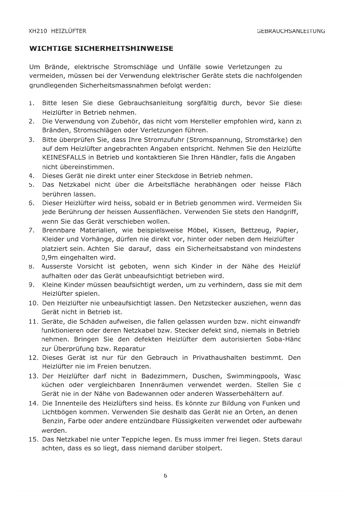 Dieses Gerät ist nur für den Gebrauch in Privathaushalten bestimmt. Den Heizlüfter nie im Freien benutzen.