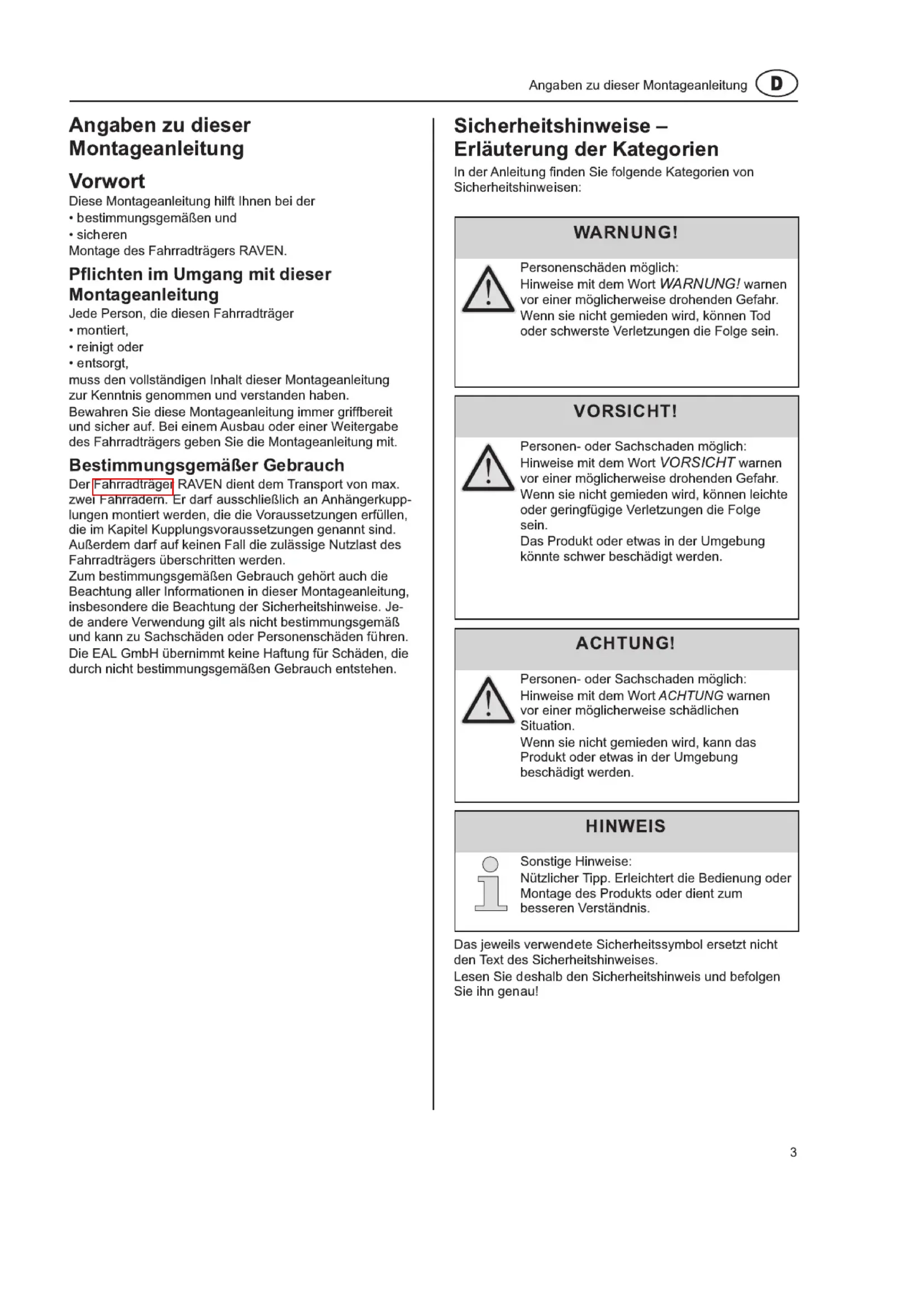 - entsorgt, muss den vollständigen Inhalt dieser Montageanleitung zur Kenntnis genommen und verstanden haben. Bewahren Sie diese Montageanleitung immer griffbereit und sicher auf. Bei einem Ausbau oder einer Weitergabe des Fahrradträgers geben Sie die Montageanleitung mit. Bestimmungsgemäßer Gebrauch Der Fahrradträger RAVEN dient dem Transport von max. zwei Fahrrädern. Er darf ausschließlich an Anhängerkupp- lungen montiert werden, die die Voraussetzungen erfüllen, die im Kapitel Kupplungsvoraussetzungen genannt sind. Außerdem darf auf keinen Fall die zulässige Nutzlast des Fahrradträgers überschritten werden. Zum bestimmungsgemäßen Gebrauch gehört auch die Beachtung aller Informationen in dieser Montageanleitung, insbesondere die Beachtung der Sicherheitshinweise. Je- de andere Verwendung gilt als nicht bestimmungsgemäß und kann zu Sachschäden oder Personenschäden führen. Die EAL GmbH übernimmt keine Haftung für Schäden, die durch nicht bestimmungsgemäßen Gebrauch entstehen.4 WARNUNG! Personen- oder Sachschaden durch Verlieren der Fahrräder. Das Fahren ohne Sicherheitsgurte kann zu Unfällen führen.