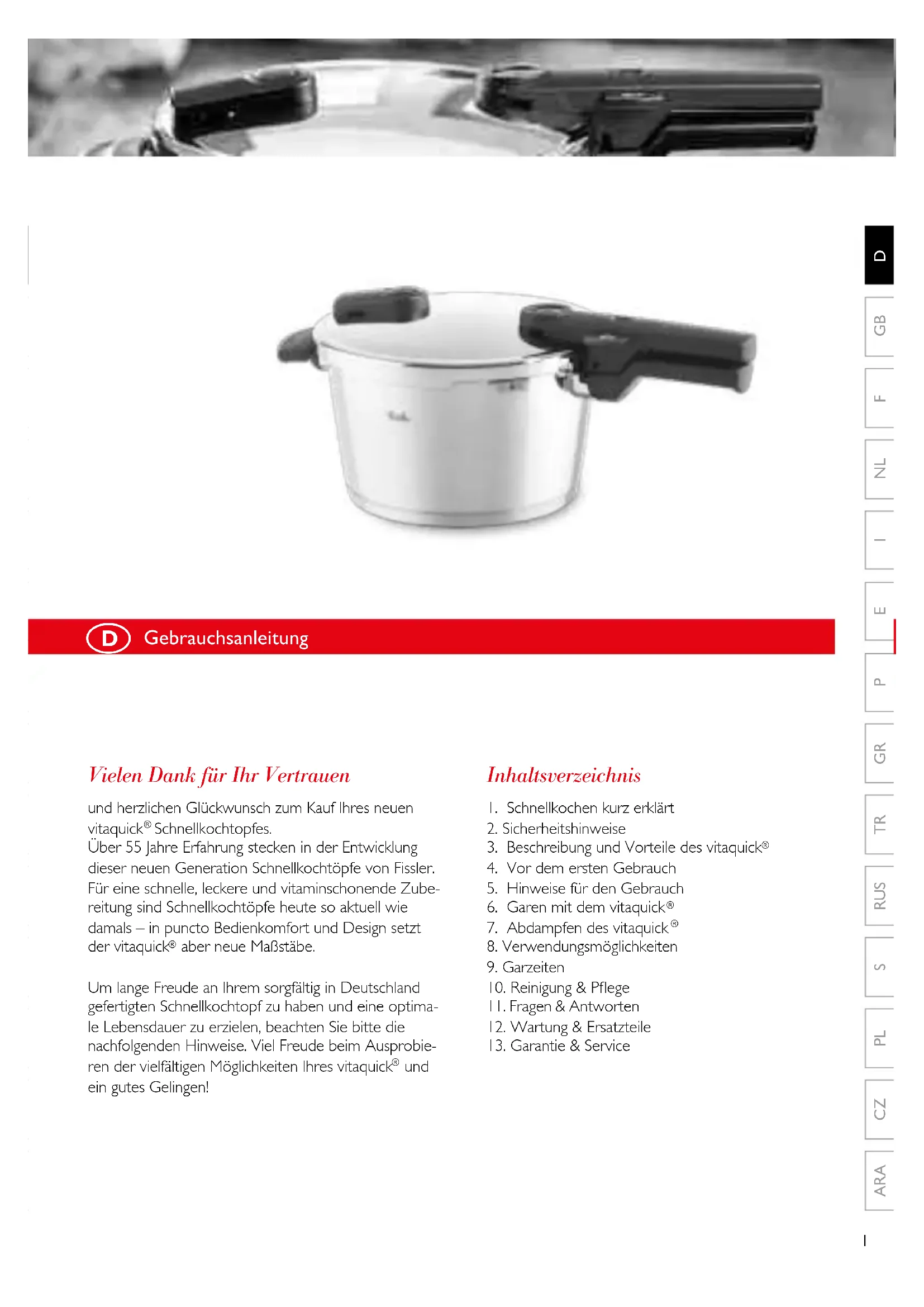 Um lange Freude an Ihr dem sorgfältig in Deutschland gefertigten Schnellkochtopf zu haben und eine optima le Lebensdauer zu erzielen, beachten Sieitte die nachfolgenden Hinweise. Viel Freude beim Ausprobieren der vielfaltigen Mogglichkeiten Ihres vitaquick und ein gutes Gelingen!