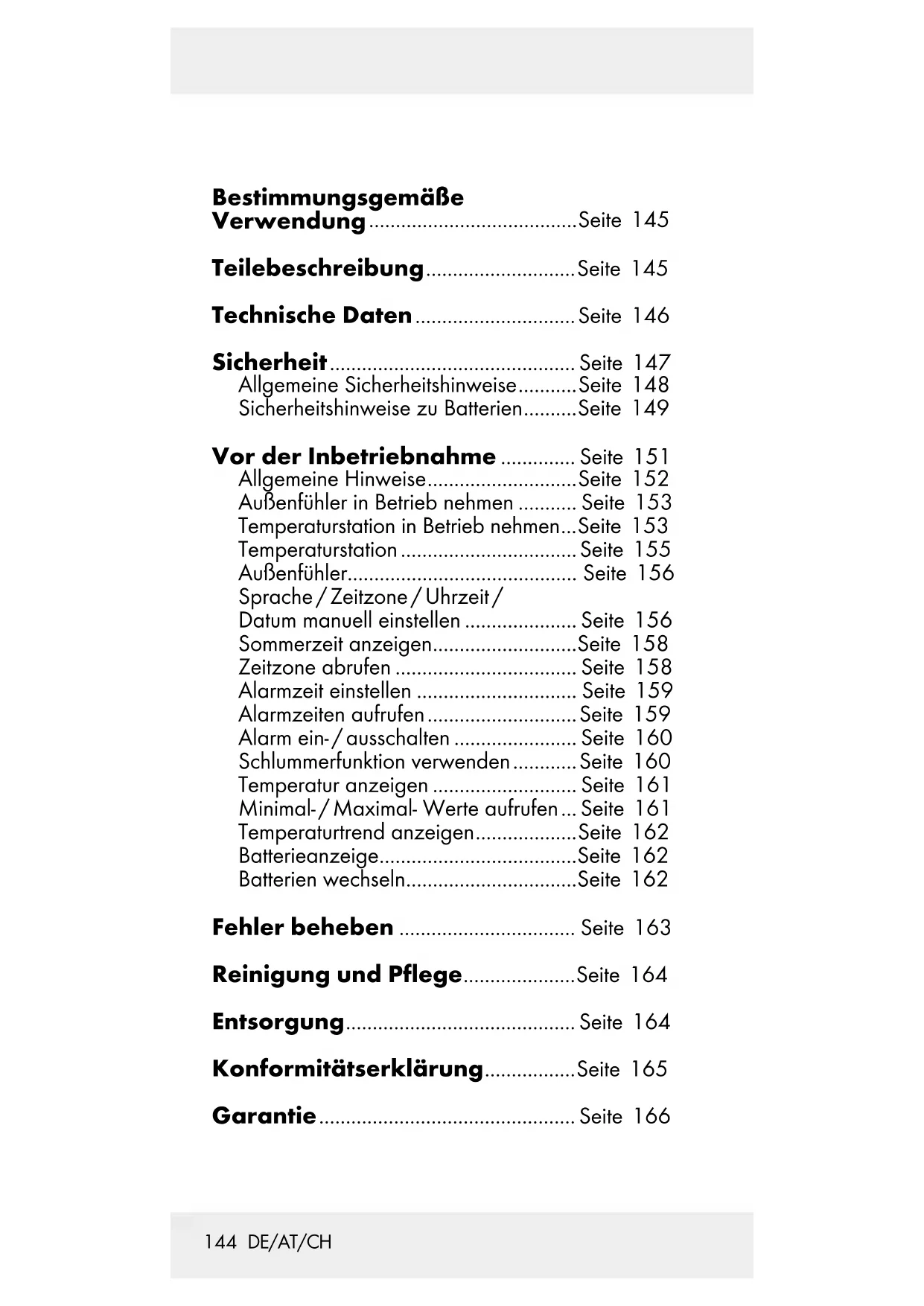 cu’s of dergelijke onderdelen, die gemaakt zijn van glas.144 DE/AT/CH Bestimmungsgemäße Verwendung ....................................... Seite 145 Teilebeschreibung ............................ Seite 145 Technische Daten .............................. Seite 146 Sicherheit .............................................. Seite 147 Allgemeine Sicherheitshinweise ........... Seite 148 Sicherheitshinweise zu Batterien .......... Seite 149 Vor der Inbetriebnahme .............. Seite 151 Allgemeine Hinweise ............................ Seite 152 Außenfühler in Betrieb nehmen ........... Seite 153 Temperaturstation in Betrieb nehmen ... Seite 153 Temperaturstation ................................. Seite 155 Außenfühler........................................... Seite 156 Sprache / Zeitzone / Uhrzeit / Datum manuell einstellen ..................... Seite 156 Sommerzeit anzeigen ........................... Seite 158 Zeitzone abrufen .................................. Seite 158 Alarmzeit einstellen .............................. Seite 159 Alarmzeiten aufrufen ............................ Seite 159 Alarm ein- / ausschalten ....................... Seite 160 Schlummerfunktion verwenden ............ Seite 160 Temperatur anzeigen ........................... Seite 161 Minimal- / Maximal- Werte aufrufen ... Seite 161 Temperaturtrend anzeigen ................... Seite 162 Batterieanzeige ..................................... Seite 162 Batterien wechseln ................................ Seite 162 Fehler beheben ................................. Seite 163 Reinigung und Pflege ..................... Seite 164 Entsorgung ........................................... Seite 164 Konformitätserklärung ................. Seite 165 Garantie ................................................ Seite 166145 DE/AT/CH Temperaturstation Bestimmungsgemäße Verwendung Die Temperaturstation zeigt die Innen- und Außentemperatur in Celsius (°C) oder Fah- renheit (°F) sowie deren Maximal- und Mini- malwerte an. Weitere Anzeigewerte der Temperaturstation sind die Zeit im 12- / 24- Stundenformat sowie das Datum. Des Weiteren verfügt die Temperaturstation über eine Alarm- funktion. Das Gerät ist nicht für den gewerbli- chen Einsatz bestimmt. Teilebeschreibung LC-Display