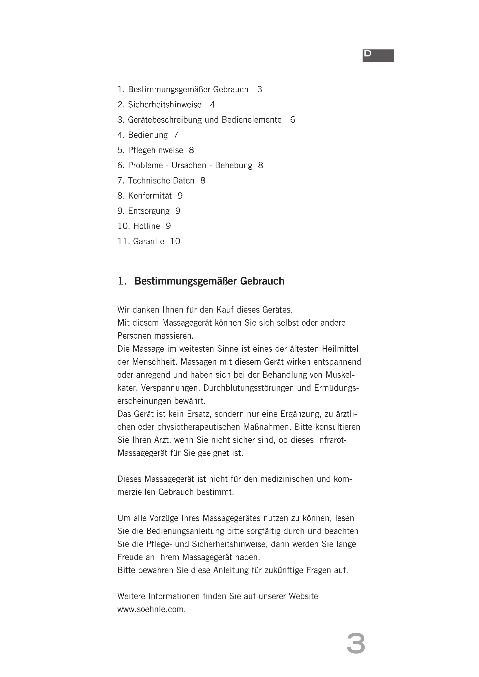 Wir danken Ihnen für den Kauf dieses Gerätes. Mit diesem Massagegerät können Sie sich selbst oder andere Personen massieren. Die Massage im weitesten Sinne ist eines der ältesten Heilmittel der Menschheit. Massagen mit diesem Gerät wirken entspannend oder anregend und haben sich bei der Behandlung von Muskel- kater, Verspannungen, Durchblutungsstörungen und Ermüdungs- erscheinungen bewährt. Das Gerät ist kein Ersatz, sondern nur eine Ergänzung, zu ärztli- chen oder physiotherapeutischen Maßnahmen. Bitte konsultieren Sie Ihren Arzt, wenn Sie nicht sicher sind, ob dieses Infrarot- Massagegerät für Sie geeignet ist. Dieses Massagegerät ist nicht für den medizinischen und kom- merziellen Gebrauch bestimmt. Um alle Vorzüge Ihres Massagegerätes nutzen zu können, lesen Sie die Bedienungsanleitung bitte sorgfältig durch und beachten Sie die Pflege- und Sicherheitshinweise, dann werden Sie lange Freude an Ihrem Massagegerät haben. Bitte bewahren Sie diese Anleitung für zukünftige Fragen auf. Weitere Informationen finden Sie auf unserer Website www.soehnle.com.4