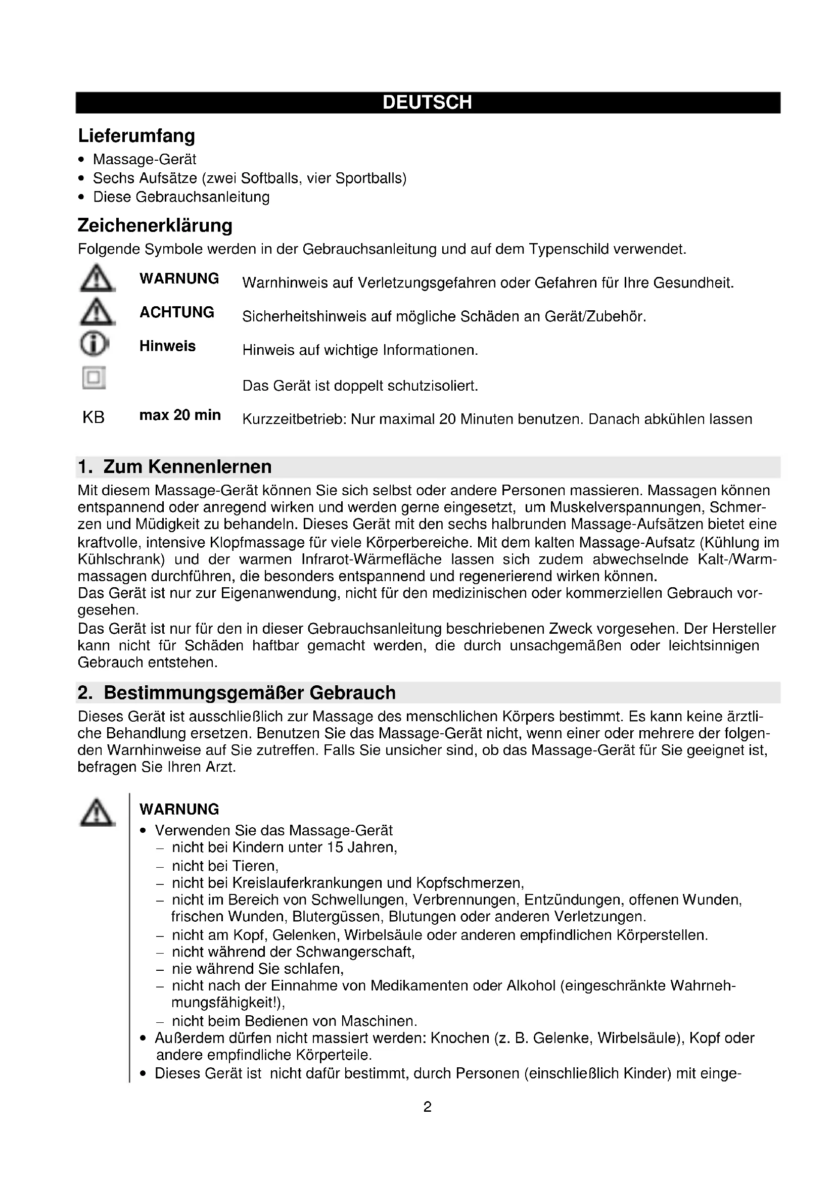 Mit diesem Massage-Gerät können Sie sich selbst oder andere Personen massieren. Massagen können entspannend oder anregend wirken und werden gerne eingesetzt, um Muskelverspannungen, Schmer- zen und Müdigkeit zu behandeln. Dieses Gerät mit den sechs halbrunden Massage-Aufsätzen bietet eine kraftvolle, intensive Klopfmassage für viele Körperbereiche. Mit dem kalten Massage-Aufsatz (Kühlung im Kühlschrank) und der warmen Infrarot-Wärmefläche lassen sich zudem abwechselnde Kalt-/Warm- massagen durchführen, die besonders entspannend und regenerierend wirken können. Das Gerät ist nur zur Eigenanwendung, nicht für den medizinischen oder kommerziellen Gebrauch vor- gesehen. Das Gerät ist nur für den in dieser Gebrauchsanleitung beschriebenen Zweck vorgesehen. Der Hersteller kann nicht für Schäden haftbar gemacht werden, die durch unsachgemäßen oder leichtsinnigen Gebrauch entstehen.