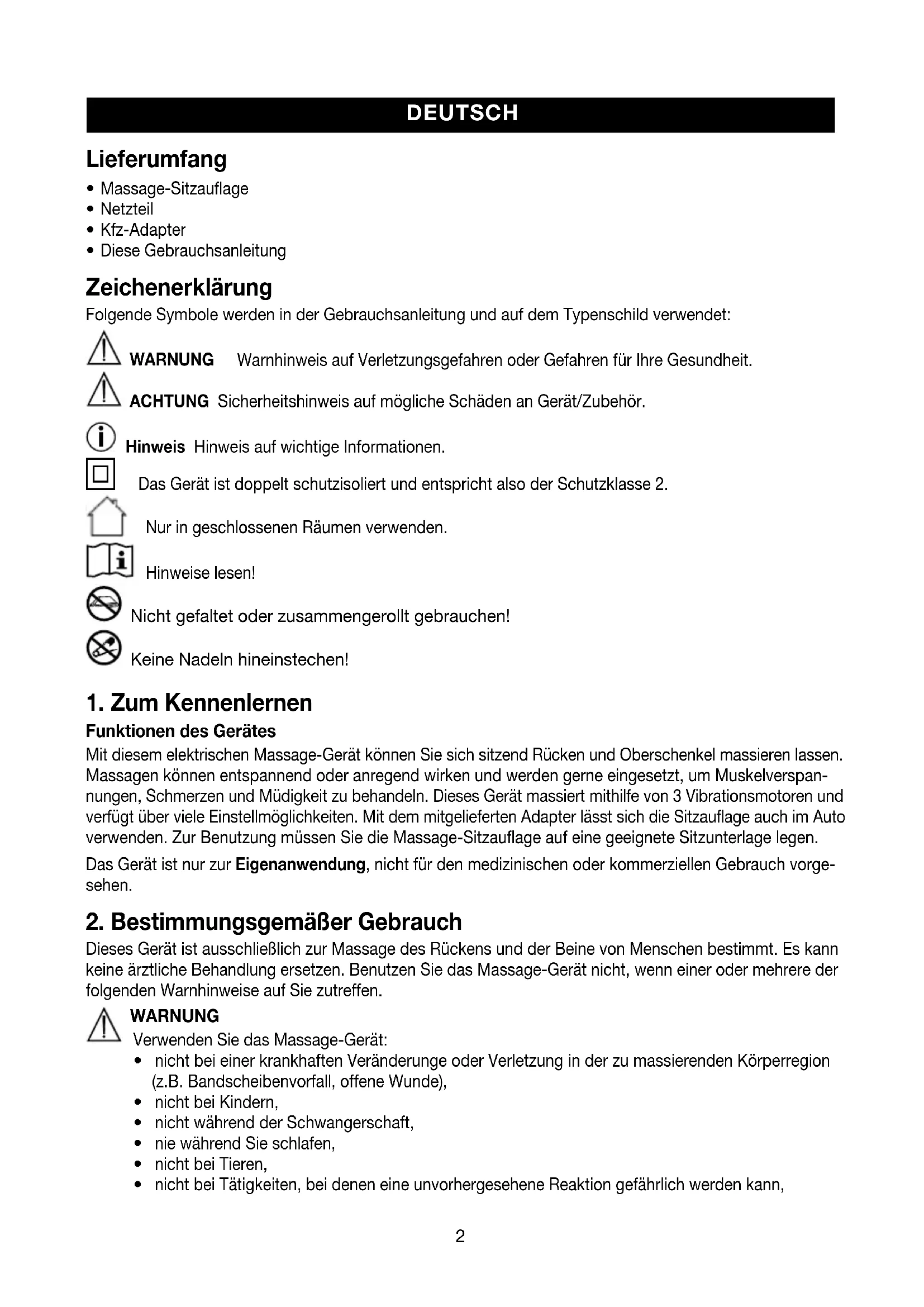 Dieses Gerät ist ausschließlich zur Massage des Rückens und der Beine von Menschen bestimmt. Es kann keine ärztliche Behandlung ersetzen. Benutzen Sie das Massage-Gerät nicht, wenn einer oder mehrere der folgenden Warnhinweise auf Sie zutreffen. WARNUNG Verwenden Sie das Massage-Gerät: