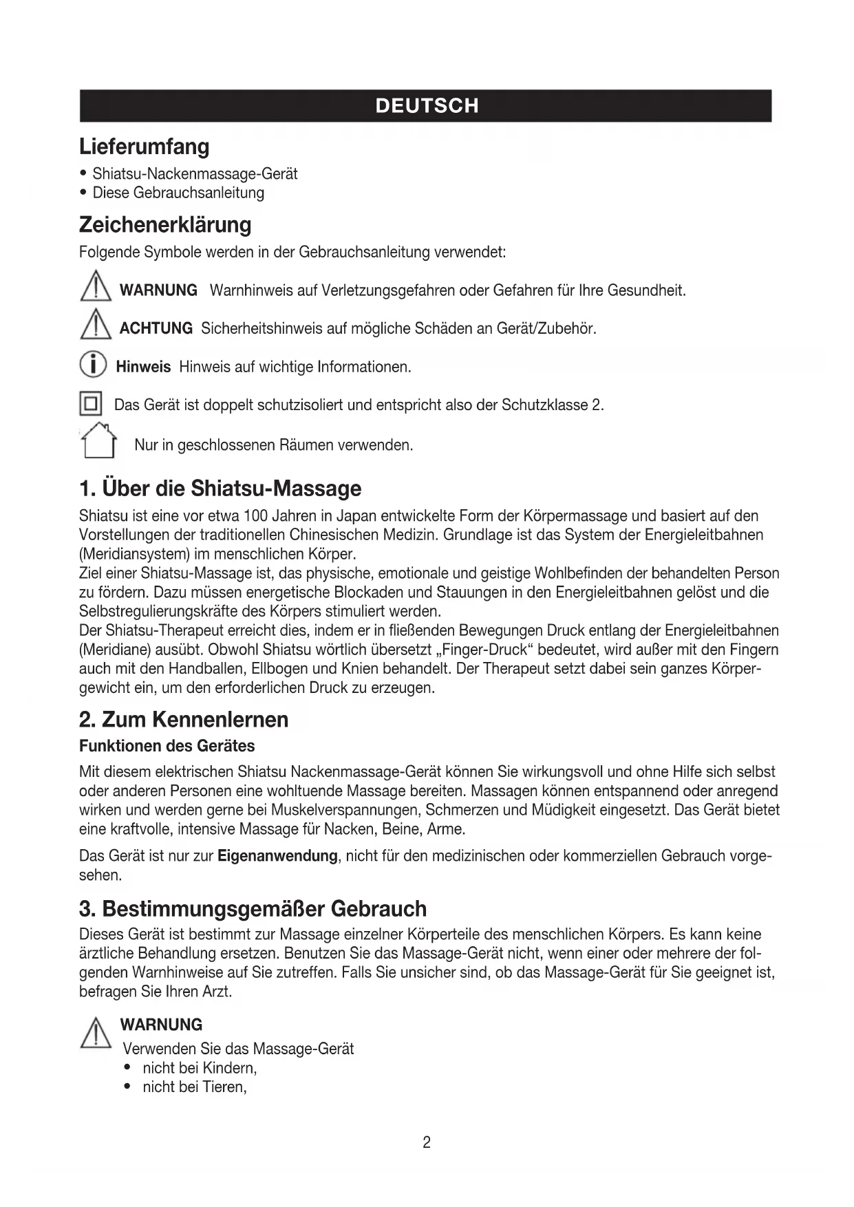 Funktionen des Gerätes Mit diesem elektrischen Shiatsu Nackenmassage-Gerät können Sie wirkungsvoll und ohne Hilfe sich selbst oder anderen Personen eine wohltuende Massage bereiten. Massagen können entspannend oder anregend wirken und werden gerne bei Muskelverspannungen, Schmerzen und Müdigkeit eingesetzt. Das Gerät bietet eine kraftvolle, intensive Massage für Nacken, Beine, Arme. Das Gerät ist nur zur Eigenanwendung, nicht für den medizinischen oder kommerziellen Gebrauch vorge- sehen.