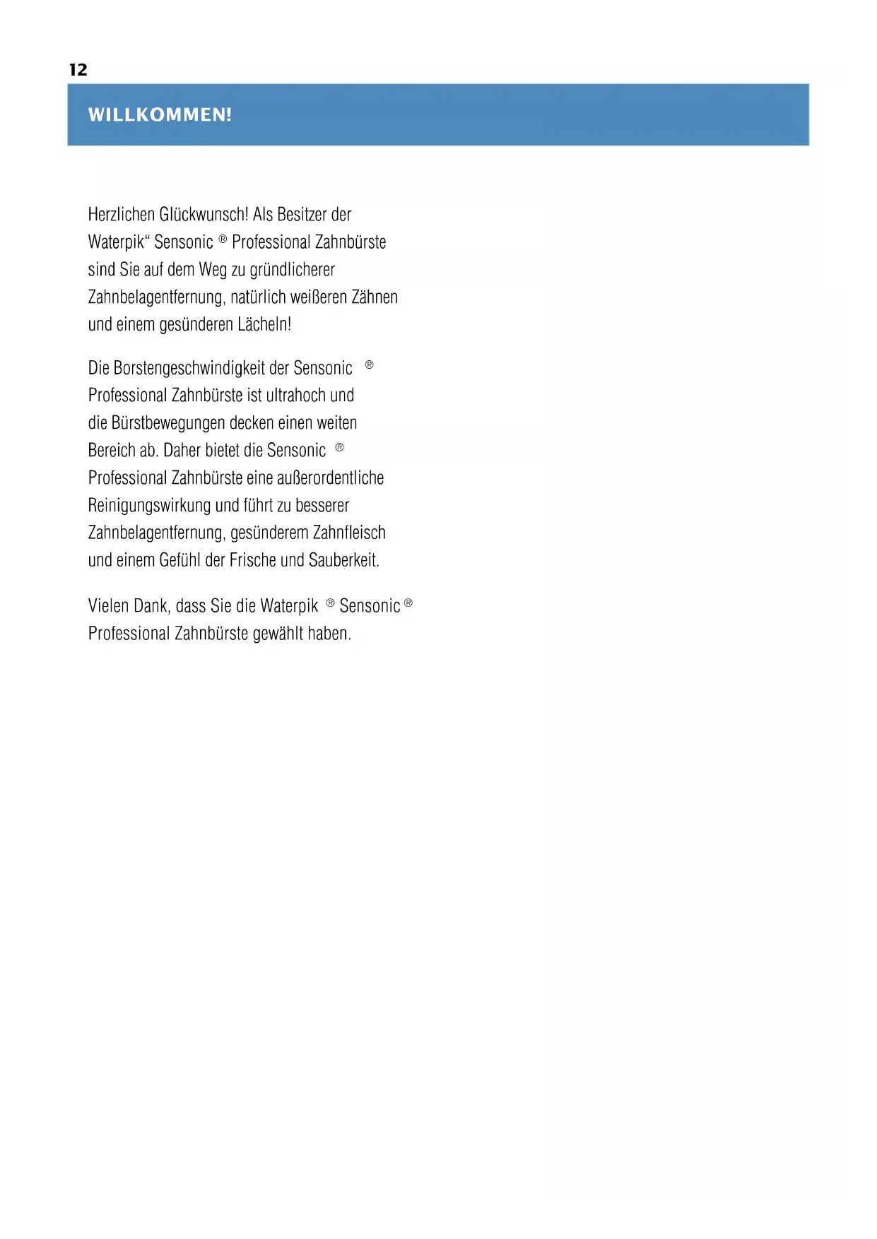 Vielen Dank, dass Sie die Waterpik ® Sensonic ® Professional Zahnbürste gewählt haben.