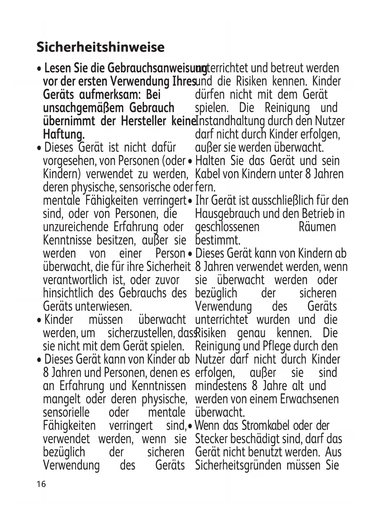 - Dieses Gerät kann von Kinder ab 8 Jahren und Personen, denen es an Erfahrung und Kenntnissen mangelt oder deren physische, sensorielle oder mentale Fähigkeiten verringert sind, verwendet werden, wenn sie bezüglich der sicheren Verwendung des Geräts unterrichtet und betreut werden und die Risiken kennen. Kinder dürfen nicht mit dem Gerät spielen. Die Reinigung und Instandhaltung durch den Nutzer darf nicht durch Kinder erfolgen, außer sie werden überwacht.