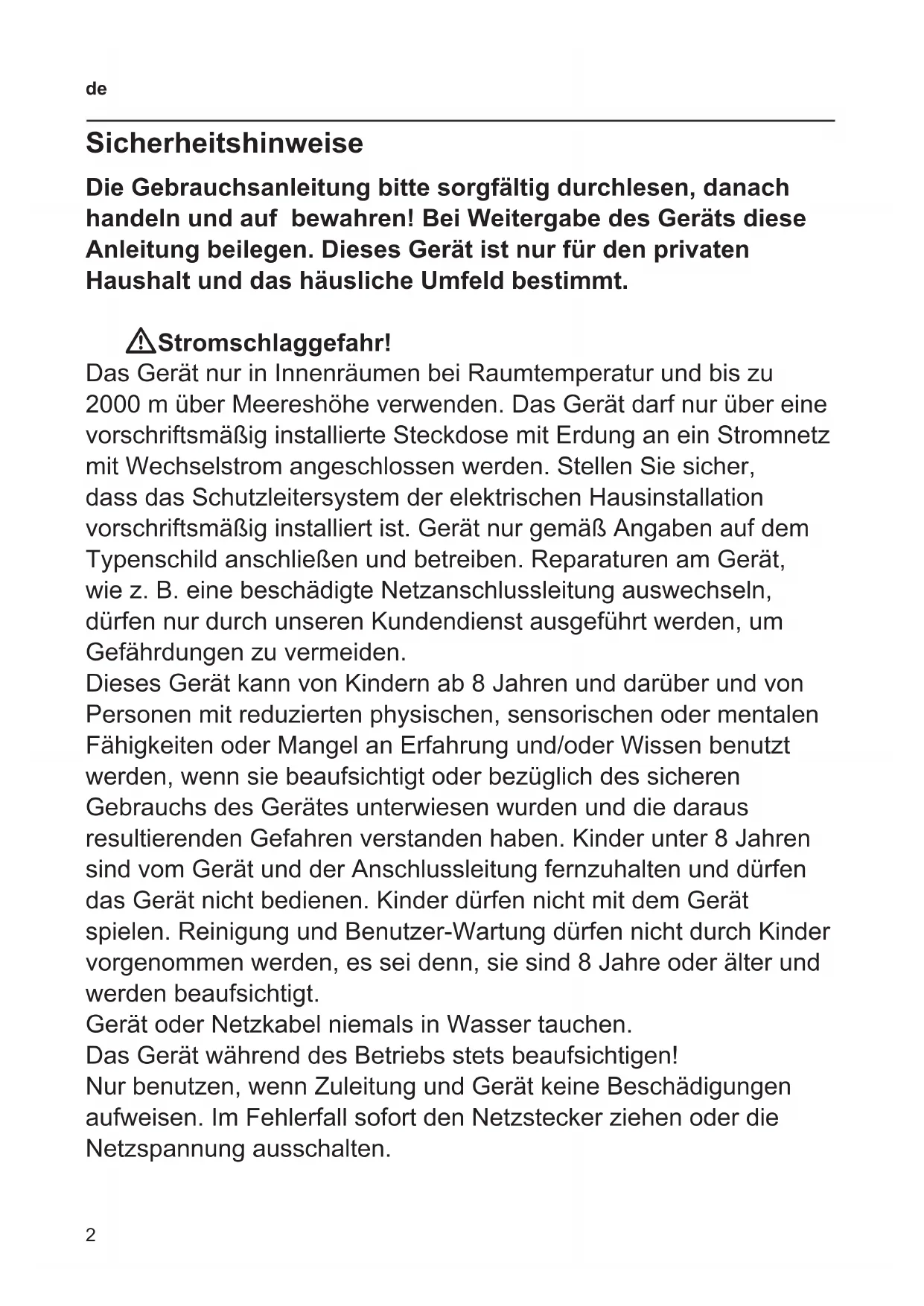 Sicherheitshinweise Die Gebrauchsanleitung bitte sorgfältig durchlesen, danach handeln und auf bewahren! Bei Weitergabe des Geräts diese Anleitung beilegen. Dieses Gerät ist nur für den privaten Haushalt und das häusliche Umfeld bestimmt. WStromschlaggefahr! Das Gerät nur in Innenräumen bei Raumtemperatur und bis zu 2000 m über Meereshöhe verwenden. Das Gerät darf nur über eine vorschriftsmäßig installierte Steckdose mit Erdung an ein Stromnetz mit Wechselstrom angeschlossen werden. Stellen Sie sicher, dass das Schutzleitersystem der elektrischen Hausinstallation vorschriftsmäßig installiert ist. Gerät nur gemäß Angaben auf dem Typenschild anschließen und betreiben. Reparaturen am Gerät, wie z. B. eine beschädigte Netzanschlussleitung auswechseln, dürfen nur durch unseren Kundendienst ausgeführt werden, um Gefährdungen zu vermeiden. Dieses Gerät kann von Kindern ab 8 Jahren und darüber und von Personen mit reduzierten physischen, sensorischen oder mentalen Fähigkeiten oder Mangel an Erfahrung und/oder Wissen benutzt werden, wenn sie beaufsichtigt oder bezüglich des sicheren Gebrauchs des Gerätes unterwiesen wurden und die daraus resultierenden Gefahren verstanden haben. Kinder unter 8 Jahren sind vom Gerät und der Anschlussleitung fernzuhalten und dürfen das Gerät nicht bedienen. Kinder dürfen nicht mit dem Gerät spielen. Reinigung und Benutzer-Wartung dürfen nicht durch Kinder vorgenommen werden, es sei denn, sie sind 8 Jahre oder älter und werden beaufsichtigt. Gerät oder Netzkabel niemals in Wasser tauchen. Das Gerät während des Betriebs stets beaufsichtigen! Nur benutzen, wenn Zuleitung und Gerät keine Beschädigungen aufweisen. Im Fehlerfall sofort den Netzstecker ziehen oder die Netzspannung ausschalten.3