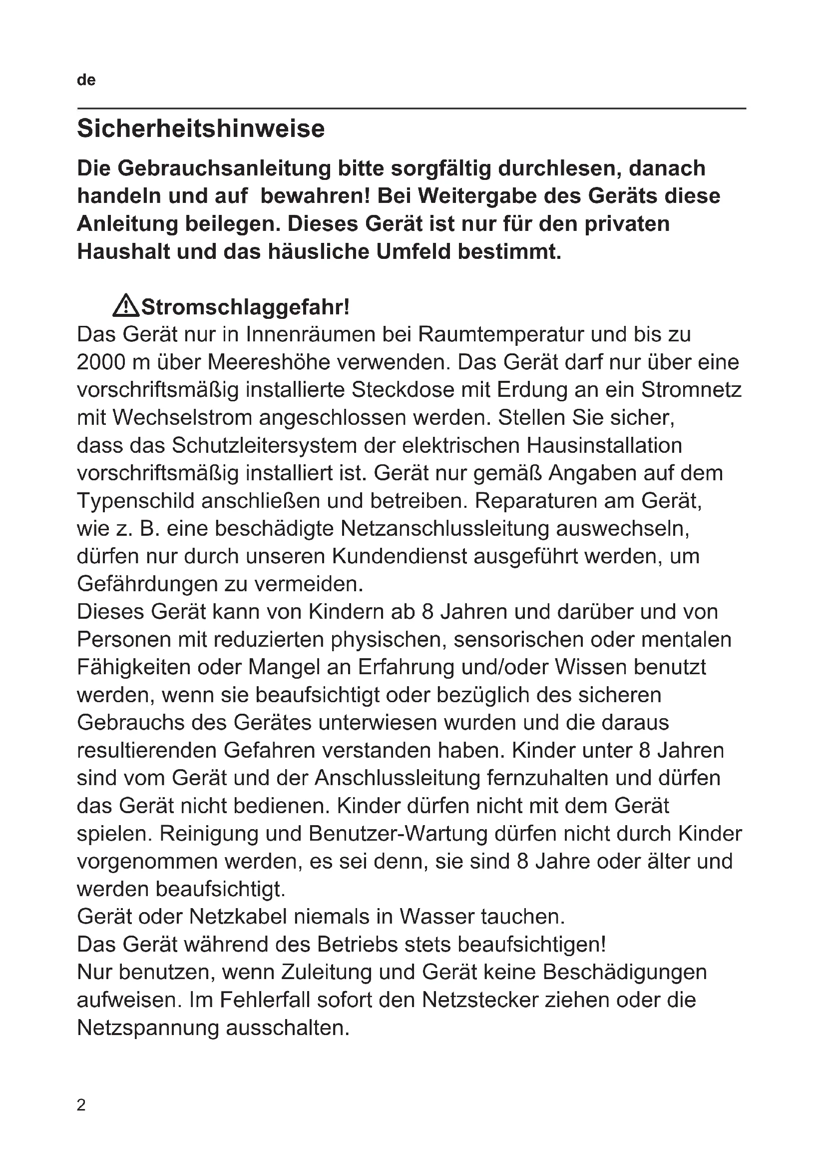 Sicherheitshinweise Die Gebrauchsanleitung bitte sorgfältig durchlesen, danach handeln und auf bewahren! Bei Weitergabe des Geräts diese Anleitung beilegen. Dieses Gerät ist nur für den privaten Haushalt und das häusliche Umfeld bestimmt. WStromschlaggefahr! Das Gerät nur in Innenräumen bei Raumtemperatur und bis zu 2000 m über Meereshöhe verwenden. Das Gerät darf nur über eine vorschriftsmäßig installierte Steckdose mit Erdung an ein Stromnetz mit Wechselstrom angeschlossen werden. Stellen Sie sicher, dass das Schutzleitersystem der elektrischen Hausinstallation vorschriftsmäßig installiert ist. Gerät nur gemäß Angaben auf dem Typenschild anschließen und betreiben. Reparaturen am Gerät, wie z. B. eine beschädigte Netzanschlussleitung auswechseln, dürfen nur durch unseren Kundendienst ausgeführt werden, um Gefährdungen zu vermeiden. Dieses Gerät kann von Kindern ab 8 Jahren und darüber und von Personen mit reduzierten physischen, sensorischen oder mentalen Fähigkeiten oder Mangel an Erfahrung und/oder Wissen benutzt werden, wenn sie beaufsichtigt oder bezüglich des sicheren Gebrauchs des Gerätes unterwiesen wurden und die daraus resultierenden Gefahren verstanden haben. Kinder unter 8 Jahren sind vom Gerät und der Anschlussleitung fernzuhalten und dürfen das Gerät nicht bedienen. Kinder dürfen nicht mit dem Gerät spielen. Reinigung und Benutzer-Wartung dürfen nicht durch Kinder vorgenommen werden, es sei denn, sie sind 8 Jahre oder älter und werden beaufsichtigt. Gerät oder Netzkabel niemals in Wasser tauchen. Das Gerät während des Betriebs stets beaufsichtigen! Nur benutzen, wenn Zuleitung und Gerät keine Beschädigungen aufweisen. Im Fehlerfall sofort den Netzstecker ziehen oder die Netzspannung ausschalten.3