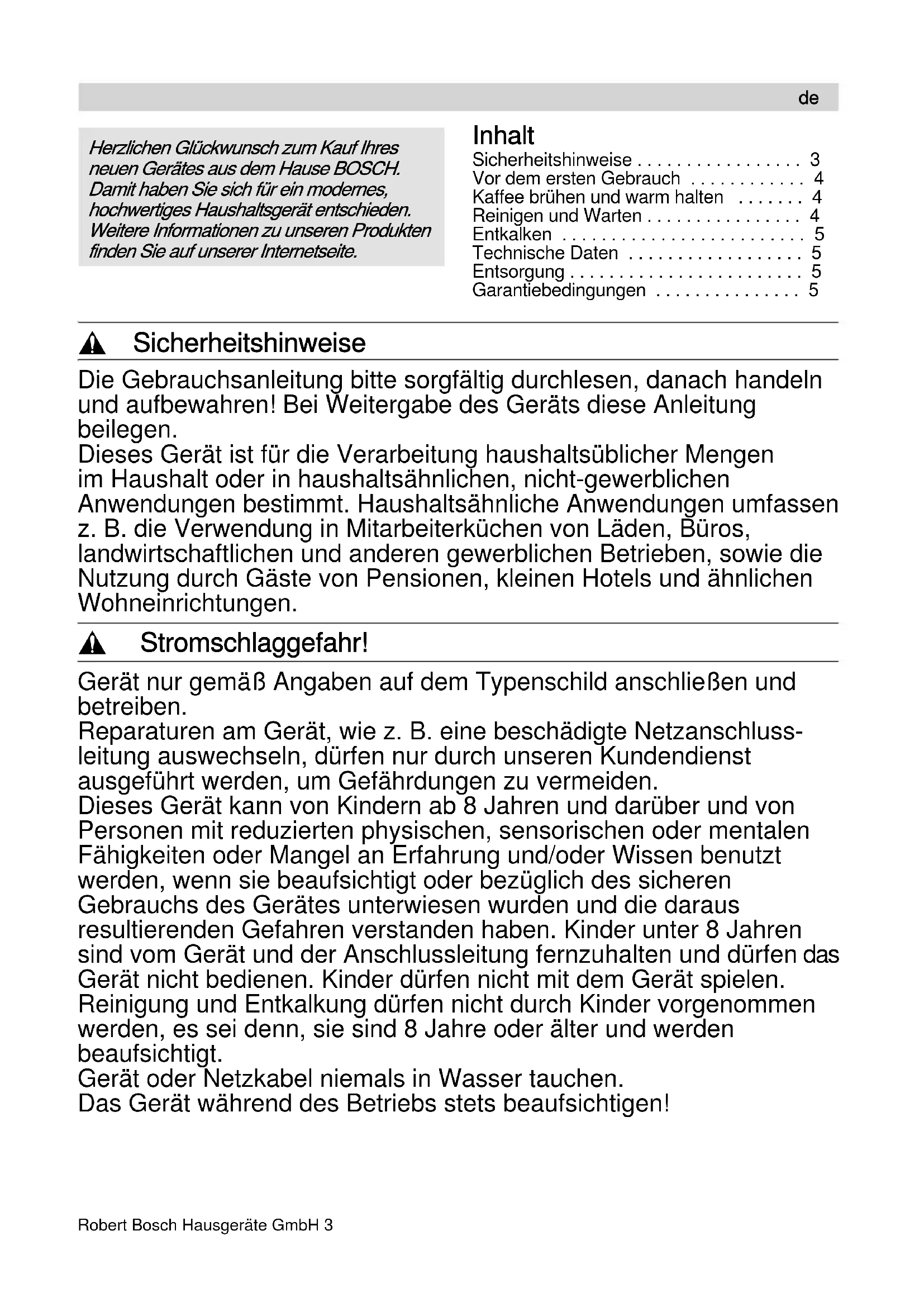 de Deutsch . . . . . . . . . . . . . . . . . . . . . . . . . . . . . . . . . . . . . . . . . . . . . . . . . . . . . . . . . .3 en English . . . . . . . . . . . . . . . . . . . . . . . . . . . . . . . . . . . . . . . . . . . . . . . . . . . . . . . . . . .6 fr Français . . . . . . . . . . . . . . . . . . . . . . . . . . . . . . . . . . . . . . . . . . . . . . . . . . . . . . . . . .9 it Italiano . . . . . . . . . . . . . . . . . . . . . . . . . . . . . . . . . . . . . . . . . . . . . . . . . . . . . . . . . .12 nl Nederlands . . . . . . . . . . . . . . . . . . . . . . . . . . . . . . . . . . . . . . . . . . . . . . . . . . . . . .15 da Dansk . . . . . . . . . . . . . . . . . . . . . . . . . . . . . . . . . . . . . . . . . . . . . . . . . . . . . . . . . .18 no Norsk . . . . . . . . . . . . . . . . . . . . . . . . . . . . . . . . . . . . . . . . . . . . . . . . . . . . . . . . . . .21 sv Svenska . . . . . . . . . . . . . . . . . . . . . . . . . . . . . . . . . . . . . . . . . . . . . . . . . . . . . . . . .24 fi Suomi . . . . . . . . . . . . . . . . . . . . . . . . . . . . . . . . . . . . . . . . . . . . . . . . . . . . . . . . . .27 es Español . . . . . . . . . . . . . . . . . . . . . . . . . . . . . . . . . . . . . . . . . . . . . . . . . . . . . . . . .30 pt Português . . . . . . . . . . . . . . . . . . . . . . . . . . . . . . . . . . . . . . . . . . . . . . . . . . . . . . .34 el Ελληνικά . . . . . . . . . . . . . . . . . . . . . . . . . . . . . . . . . . . . . . . . . . . . . . . . . . . . . . . .37 tr Türkçe . . . . . . . . . . . . . . . . . . . . . . . . . . . . . . . . . . . . . . . . . . . . . . . . . . . . . . . . . .41 pl Polski . . . . . . . . . . . . . . . . . . . . . . . . . . . . . . . . . . . . . . . . . . . . . . . . . . . . . . . . . . .46 hu Magyar . . . . . . . . . . . . . . . . . . . . . . . . . . . . . . . . . . . . . . . . . . . . . . . . . . . . . . . . . .49 ro Româneşte . . . . . . . . . . . . . . . . . . . . . . . . . . . . . . . . . . . . . . . . . . . . . . . . . . . . . .52 bg Български . . . . . . . . . . . . . . . . . . . . . . . . . . . . . . . . . . . . . . . . . . . . . . . . . . . . . . .55 ru Русский . . . . . . . . . . . . . . . . . . . . . . . . . . . . . . . . . . . . . . . . . . . . . . . . . . . . . . . . .58 ar . . . . . . . . . . . . . . . . . . . . . . . . . . . . . . . . . . . . . . . . . . . . . . . . . . . . . . . . . . .63 . . . . . . . . . . . . . . . . . . . . . . . . . . . . . . . . . . . . . . . . . . . . . . . . . . . .Robert Bosch Hausgeräte GmbH 3 Inhalt Sicherheitshinweise . . . . . . . . . . . . . . . . . 3 Vor dem ersten Gebrauch . . . . . . . . . . . . 4 Kaffee brühen und warm halten . . . . . . . 4 Reinigen und Warten . . . . . . . . . . . . . . . . 4 Entkalken . . . . . . . . . . . . . . . . . . . . . . . . . 5 Technische Daten . . . . . . . . . . . . . . . . . . 5 Entsorgung . . . . . . . . . . . . . . . . . . . . . . . . 5 Garantiebedingungen . . . . . . . . . . . . . . . 5 , Sicherheitshinweise Die Gebrauchsanleitung bitte sorgfältig durchlesen, danach handeln und aufbewahren! Bei Weitergabe des Geräts diese Anleitung beilegen. Dieses Gerät ist für die Verarbeitung haushaltsüblicher Mengen im Haushalt oder in haushaltsähnlichen, nicht-gewerblichen Anwendungen bestimmt. Haushaltsähnliche Anwendungen umfassen z. B. die Verwendung in Mitarbeiterküchen von Läden, Büros, landwirtschaftlichen und anderen gewerblichen Betrieben, sowie die Nutzung durch Gäste von Pensionen, kleinen Hotels und ähnlichen Wohneinrichtungen. , Stromschlaggefahr! Gerät nur gemäß Angaben auf dem Typenschild anschließen und betreiben. Reparaturen am Gerät, wie z. B. eine beschädigte Netzanschluss- leitung auswechseln, dürfen nur durch unseren Kundendienst ausgeführt werden, um Gefährdungen zu vermeiden. Dieses Gerät kann von Kindern ab 8 Jahren und darüber und von Personen mit reduzierten physischen, sensorischen oder mentalen Fähigkeiten oder Mangel an Erfahrung und/oder Wissen benutzt werden, wenn sie beaufsichtigt oder bezüglich des sicheren Gebrauchs des Gerätes unterwiesen wurden und die daraus resultierenden Gefahren verstanden haben. Kinder unter 8 Jahren sind vom Gerät und der Anschlussleitung fernzuhalten und dürfen das Gerät nicht bedienen. Kinder dürfen nicht mit dem Gerät spielen. Reinigung und Entkalkung dürfen nicht durch Kinder vorgenommen werden, es sei denn, sie sind 8 Jahre oder älter und werden beaufsichtigt. Gerät oder Netzkabel niemals in Wasser tauchen. Das Gerät während des Betriebs stets beaufsichtigen!