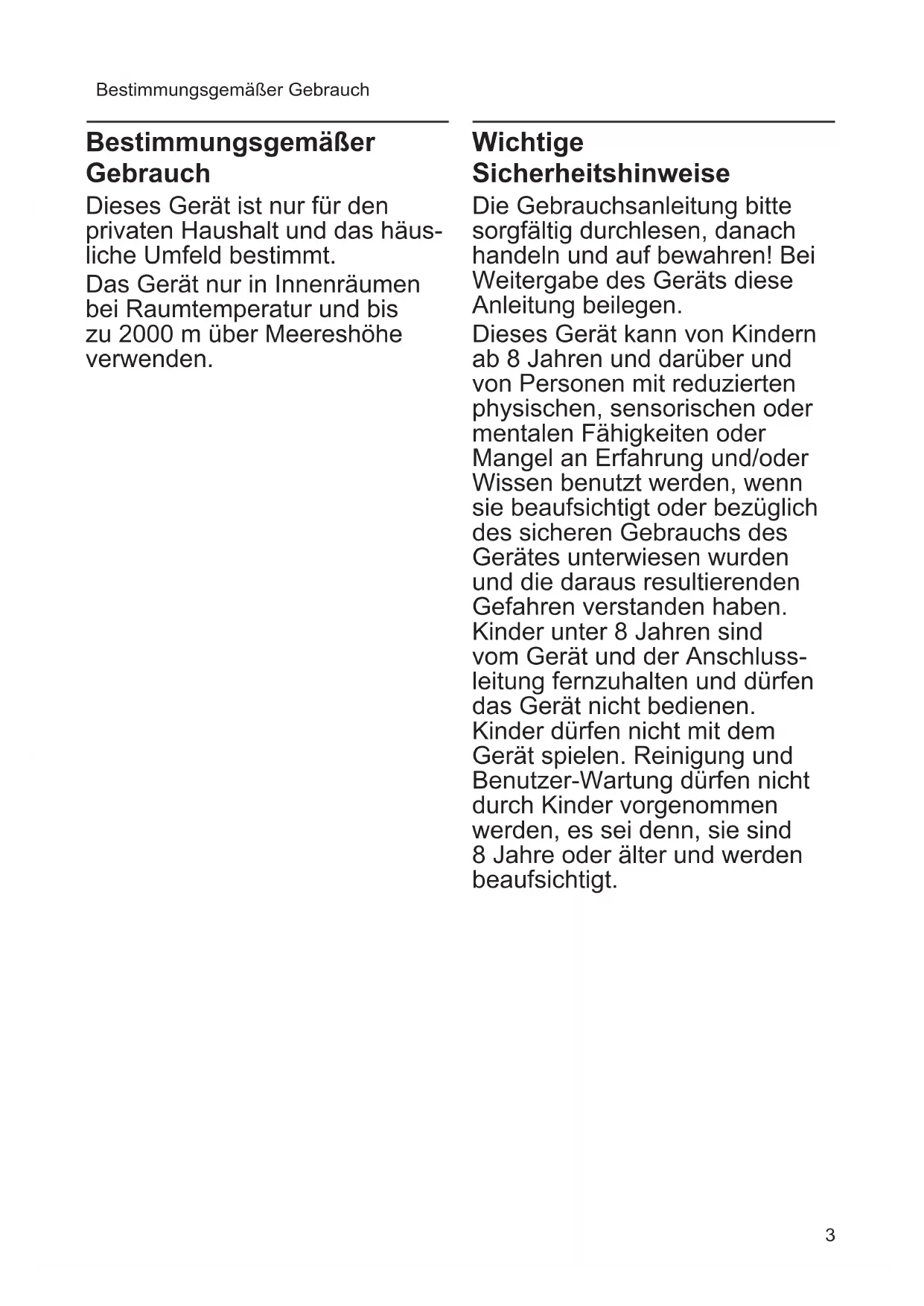 Bestimmungsgemäßer Gebrauch Bestimmungsgemäßer Gebrauch Dieses Gerät ist nur für den privaten Haushalt und das häus- liche Umfeld bestimmt. Das Gerät nur in Innenräumen bei Raumtemperatur und bis zu 2000 m über Meereshöhe verwenden. Wichtige Sicherheitshinweise Die Gebrauchsanleitung bitte sorgfältig durchlesen, danach handeln und auf bewahren! Bei Weitergabe des Geräts diese Anleitung beilegen. Dieses Gerät kann von Kindern ab 8 Jahren und darüber und von Personen mit reduzierten physischen, sensorischen oder mentalen Fähigkeiten oder Mangel an Erfahrung und/oder Wissen benutzt werden, wenn sie beaufsichtigt oder bezüglich des sicheren Gebrauchs des Gerätes unterwiesen wurden und die daraus resultierenden Gefahren verstanden haben. Kinder unter 8 Jahren sind vom Gerät und der Anschluss- leitung fernzuhalten und dürfen das Gerät nicht bedienen. Kinder dürfen nicht mit dem Gerät spielen. Reinigung und Benutzer-Wartung dürfen nicht durch Kinder vorgenommen werden, es sei denn, sie sind 8 Jahre oder älter und werden beaufsichtigt. Bestimmungsgemäßer Gebrauch Wichtige Sicherheitshinweise4 de Wichtige Sicherheitshinweise W Warnung Stromschlaggefahr! ■ Das Gerät darf nur über eine vorschriftsmäßig installierte Steckdose mit Erdung an ein Stromnetz mit Wechselstrom angeschlossen werden. Stellen Sie sicher, dass das Schutzleitersystem der elektrischen Hausinstallation vorschriftsmäßig installiert ist. ■ Gerät nur gemäß Angaben auf dem Typen schild anschließen und betreiben. ■ Nur benutzen, wenn Zuleitung und Gerät keine Beschädi- gungen aufweisen. ■ Reparaturen am Gerät, wie z. B. eine beschädigte Netz- anschlussleitung auswech- seln, dürfen nur durch unseren Kundendienst ausge- führt werden, um Gefähr- dungen zu vermeiden. ■ Gerät oder Netzkabel niemals in Wasser tauchen. ■ Im Fehlerfall sofort den Netzstecker ziehen oder die Netzspannung ausschalten. W Warnung Gefahr durch Magnetismus! Das Gerät enthält Permanent- magnete, die elektronische Implantate wie z. B. Herzschritt- macher oder Insulinpumpen beein ussen können. Träger von elektronischen Implantaten bitte einen Mindestabstand von 10 cm zum Gerät und, bei Entnahme, zu folgenden Teilen einhalten: Milchbehälter, Milchsystem, Wassertank und Brüheinheit. W Warnung Erstickungsgefahr! Kinder nicht mit Verpackungs- material spielen lassen. Klein- teile sicher aufbewahren, sie können verschluckt werden. W Warnung Verletzungsgefahr! ■ Nicht in das Mahlwerk greifen. ■ Fehlanwendung des Gerätes kann zu Verletzungen führen. W Warnung Verbrennungsgefahr! ■ Das Milchsystem wird sehr heiß. Nach Benutzung zuerst abkühlen lassen und erst dann berühren. ■ Nach dem Gebrauch können die Ober ächen von Heiz- element oder Wärmeplatte noch einige Zeit heiß sein.5